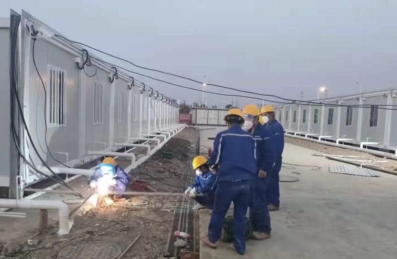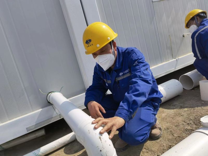 为了尽快掌握安装技巧,专业钳工出身的他带头钻进施工现场边干边摸索,在他的带领下第一套卫浴系统的集成安装仅耗时一个半小时就顺利完成,比预想工期还缩短了半小时。但王一科没有丝毫松懈,在他的细心观察下,很快发现安装好的淋浴房设备与排水管道之间存在细微漏水现象,这对于后续方舱医院的整个投入使用无疑是一个不小的隐患。王一科立即与项目技术人员进行反复试验,发现造成这一现象的根本原因是因为主排管的受力不均所致。王一科带领团队头脑风暴,很快就摸索出了一个简便快捷的改进方法,增设了一个固定装置使其均匀受力,就此一举解决了漏水问题。开工第一天,突击队就实行“白+黑”24小时不间断工作,铺管道、埋电缆、接地线…大家一鼓作气,在短短一个工作日内就顺利完成C1区域16间卫浴房的安装集成工作,为后续C3区域18间卫浴房的设备安装抢出了时间。