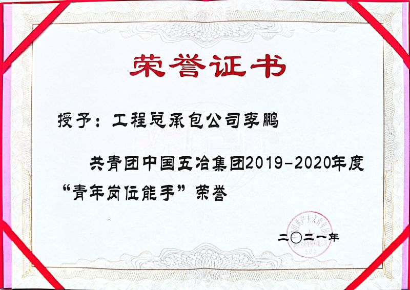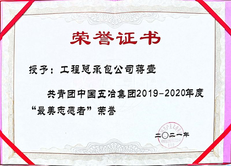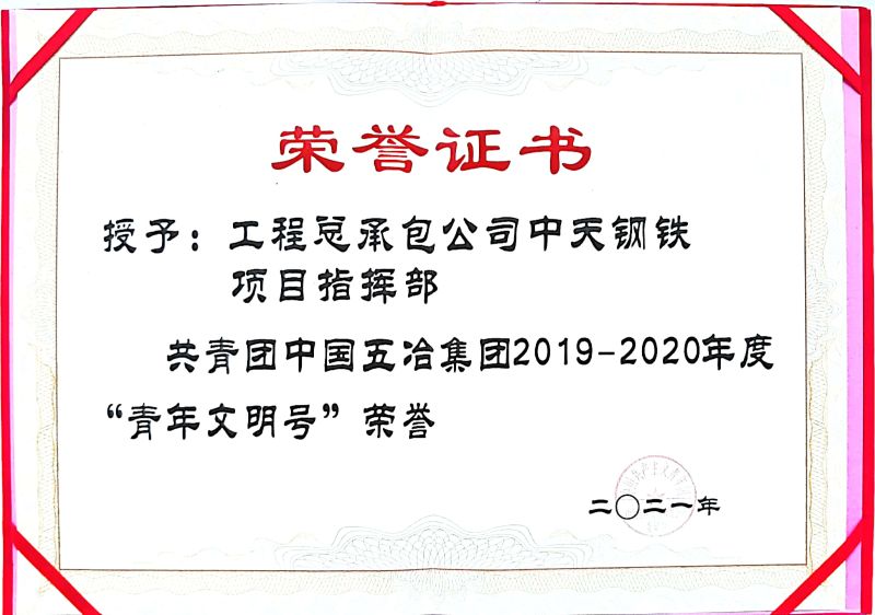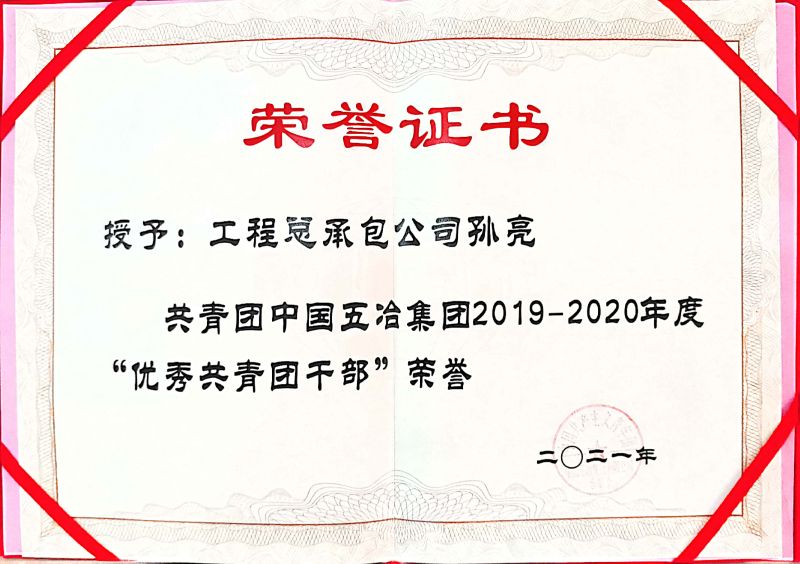4月29日,中国五冶集团团委对2019-2020年度工作中成绩突出的集体和个人进行了表彰,工程总承包公司中天钢铁项目指挥部获评“青年文明号”,团支部书记孙亮获评“优秀共青团干部”,特斯拉超级工厂项目经营经理李鹏获评“青年岗位能手”,特斯拉超级工厂项目质量主管蒋壹获评“最美志愿者”。