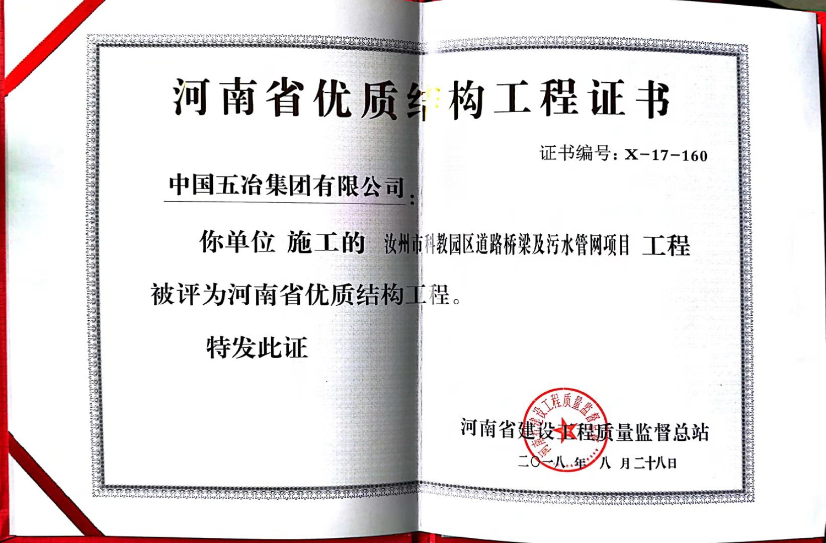 河南省优质结构工程证书—汝州科教园道路桥梁及污水管网工程