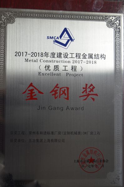 常州车和进标准厂房(定制机械类)3#厂房工程荣获2017-2018年度建设工程金属结构(优质工程)金钢奖