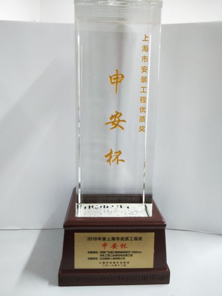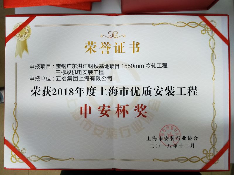 宝钢广东湛江钢铁基地项目1550mm冷轧工程三标段机电安装工程荣获2018年度上海市优质安装工程申安杯奖
