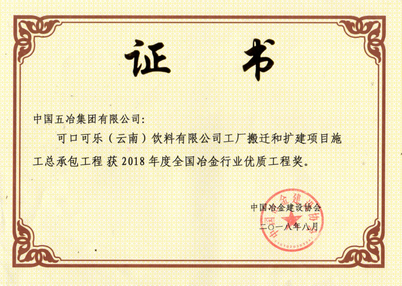 可口可乐(云南)饮料有限公司工厂搬迁和扩建项目施工总承包工程荣获2018年度全国冶金行业优质工程奖