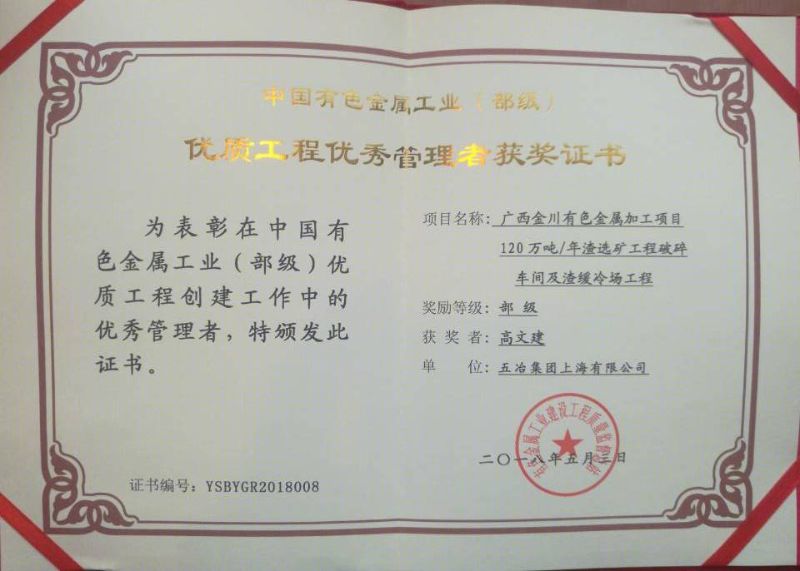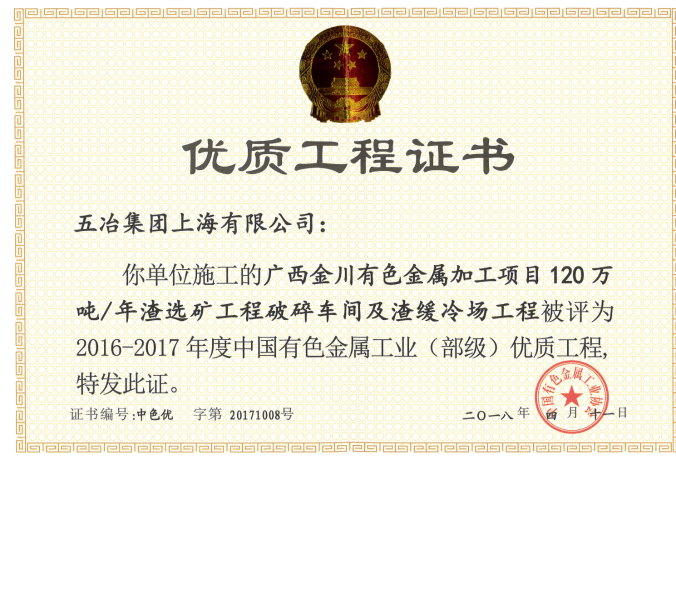 广西金川有色金属加工项目120万吨年渣选矿工程破碎车间及渣缓冷场工程荣获2016-2017年度中国有色金属工业(部级)优质工程