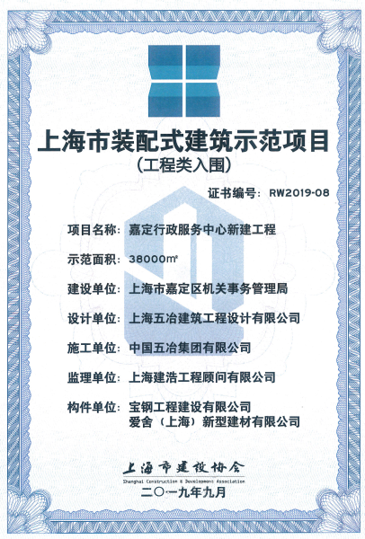 嘉定行政服务中心新建工程获2019年上海市装配式建筑示范项目(工程类入围)