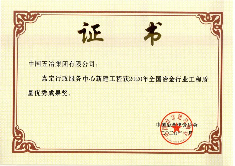 嘉定行政服务中心新建工程获2020年全国冶金行业工程质量优秀成果奖