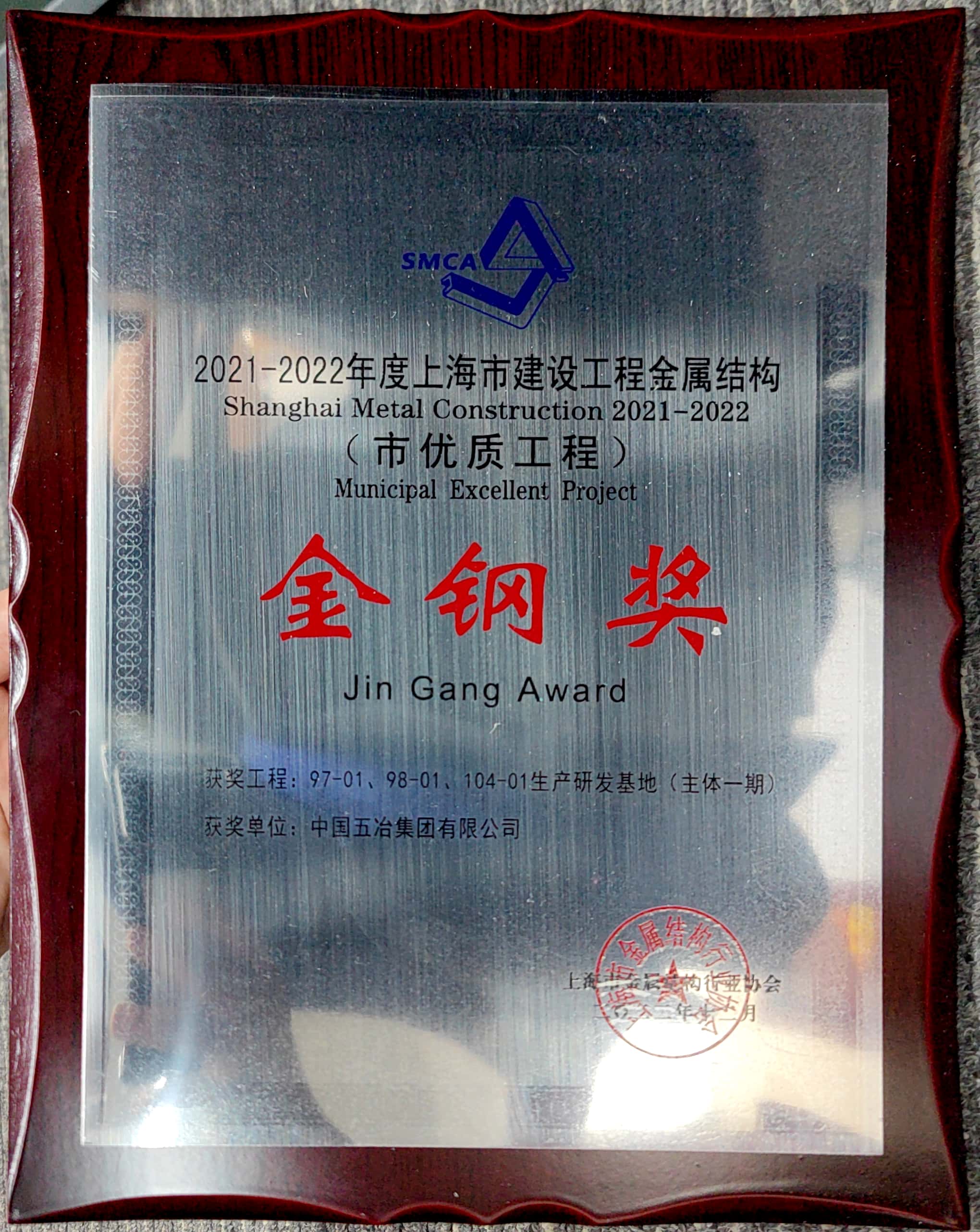 上海分公司97-01、98-01、104-01生产研发基地(主体一期)项目荣获2021-2022年度上海市建设工程金属结构(市优质工程)金钢奖