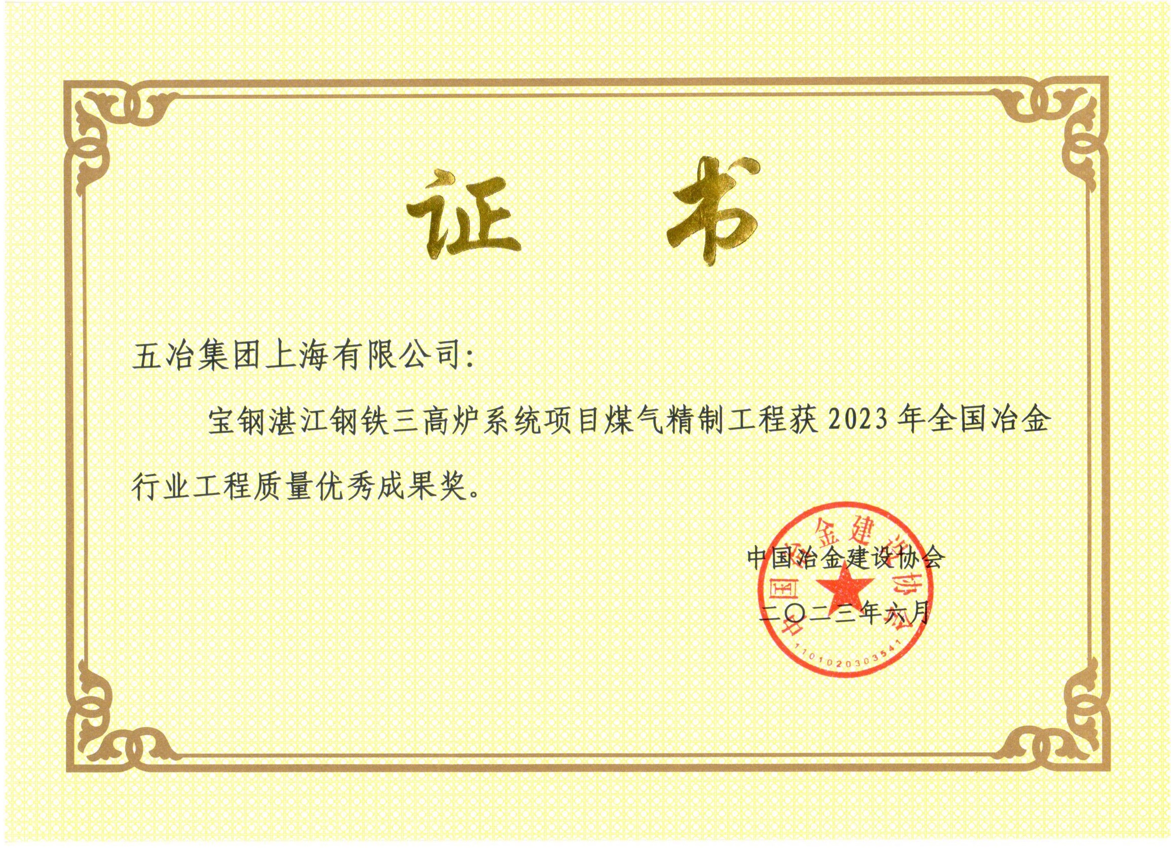 宝钢湛江钢铁三高炉系统项目煤气精制工程荣获2023年全国冶金行业工程质量优秀成果奖