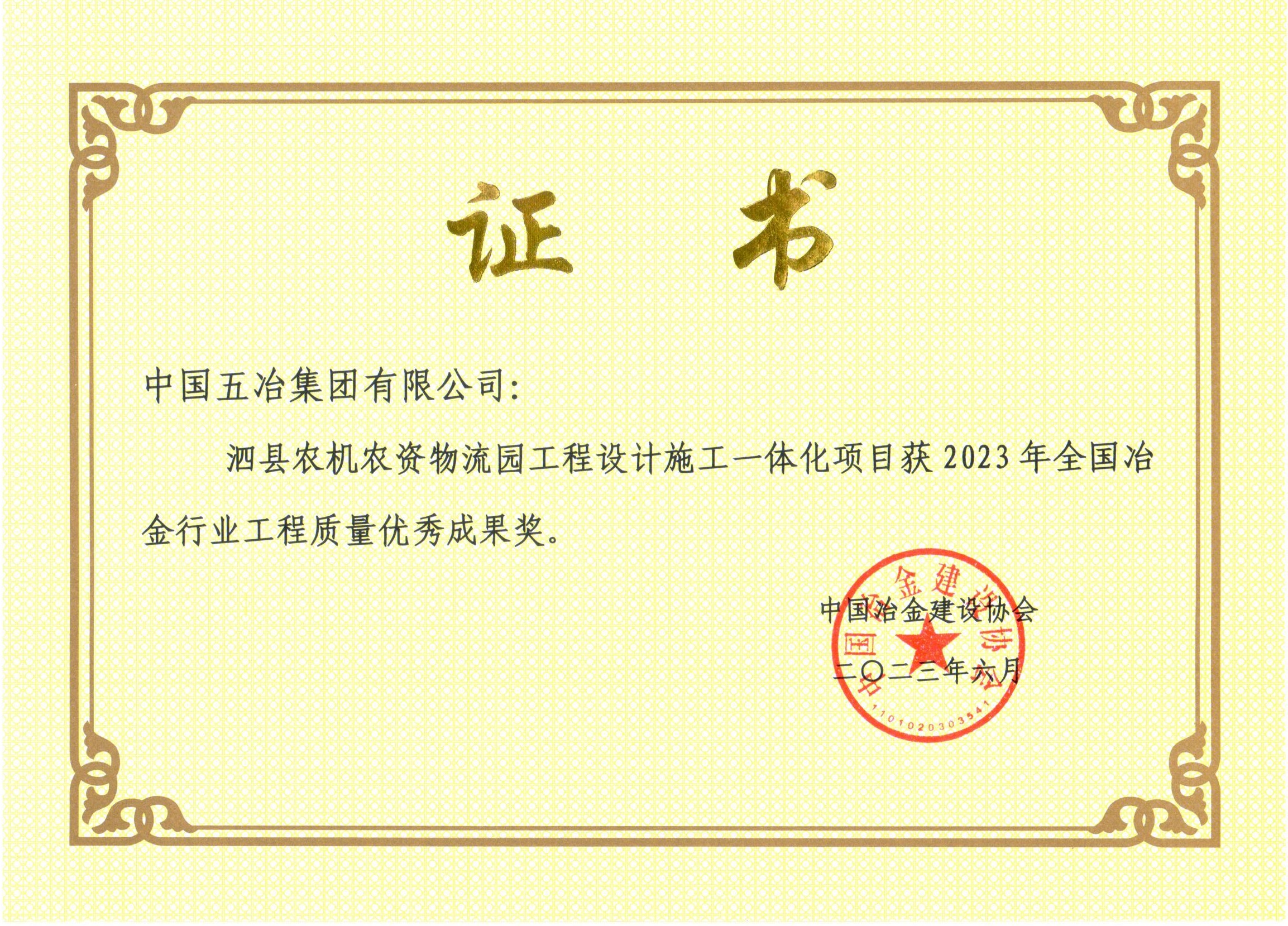 泗县农机农资物流园工程设计施工一体化项目荣获2023年全国冶金行业工程质量优秀成果奖