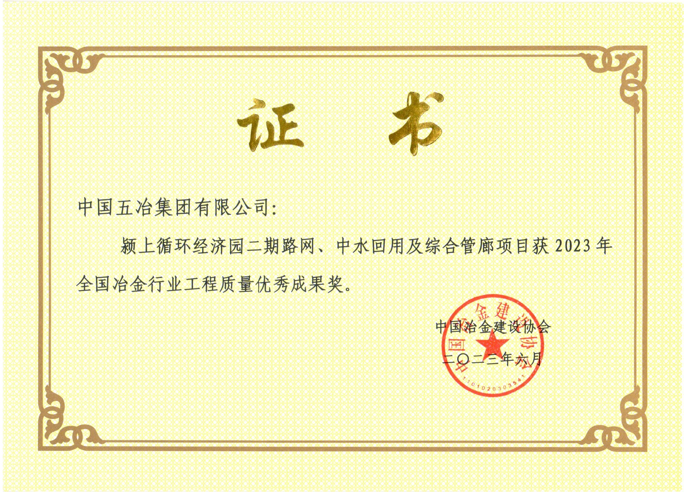 颍上循环经济园二期路网及综合管廊项目荣获2023年全国冶金行业工程质量优秀成果奖