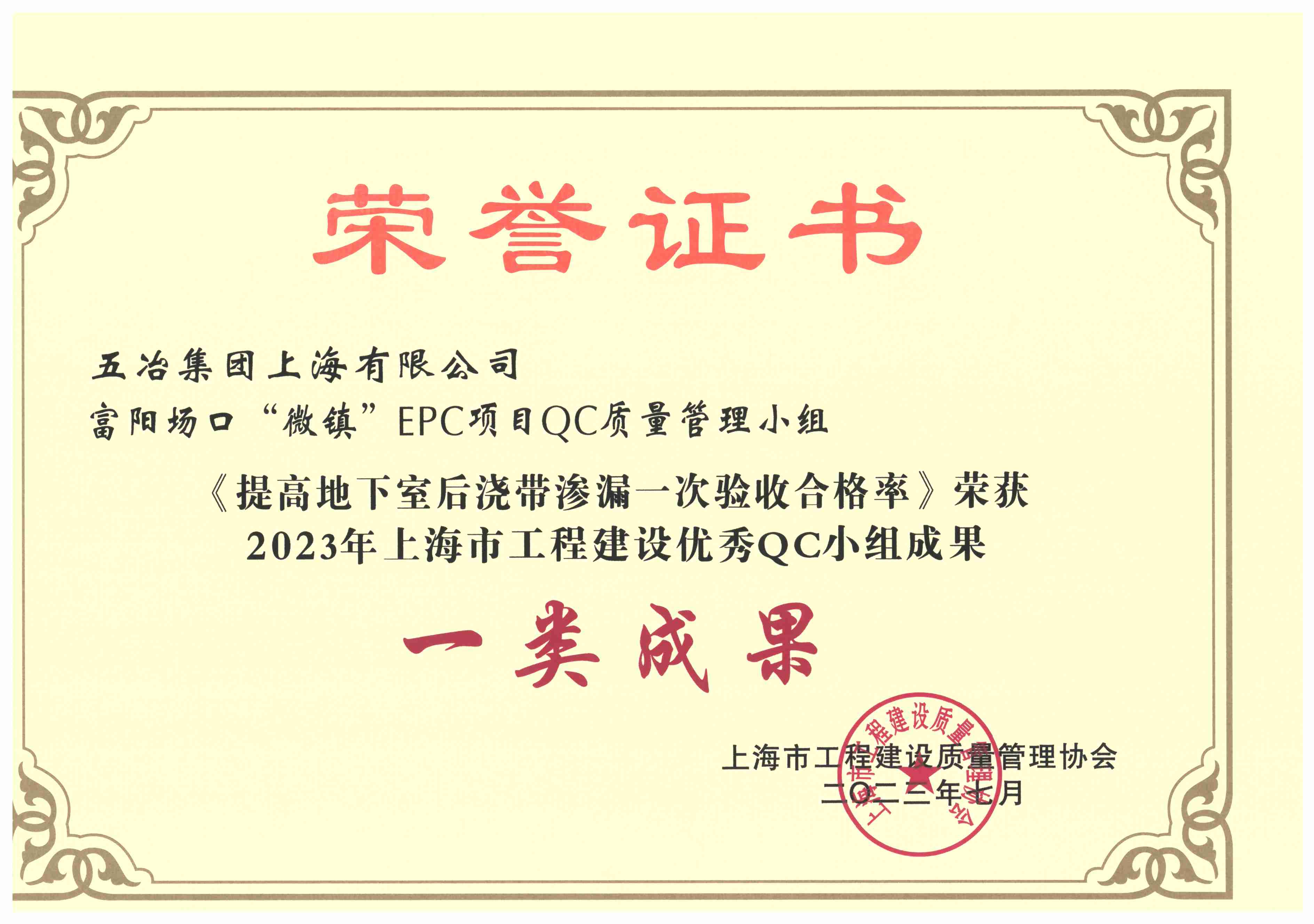 五冶集团上海有限公司富阳场口“微镇”EPC项目QC质量管理小组《提高地下室后浇带渗漏一次验收合格率》荣获2023年上海市工程建设优秀QC小组成果一类成果