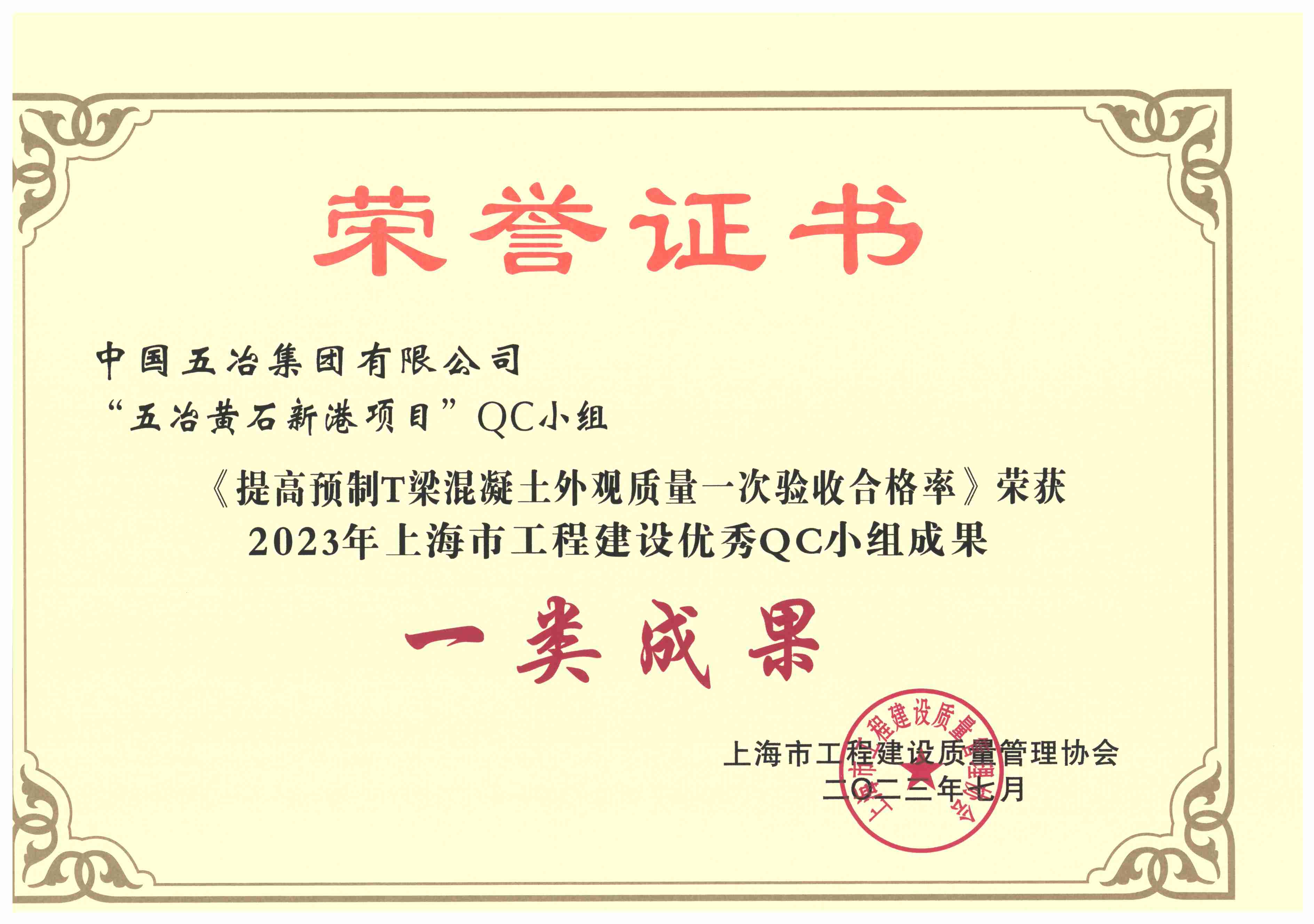 中国五冶集团有限公司“五冶黄石新港项目”QC小组《提高预制T梁混凝土外观质量一次验收合格率》荣获2023年上海市工程建设优秀QC小组成果一类成果