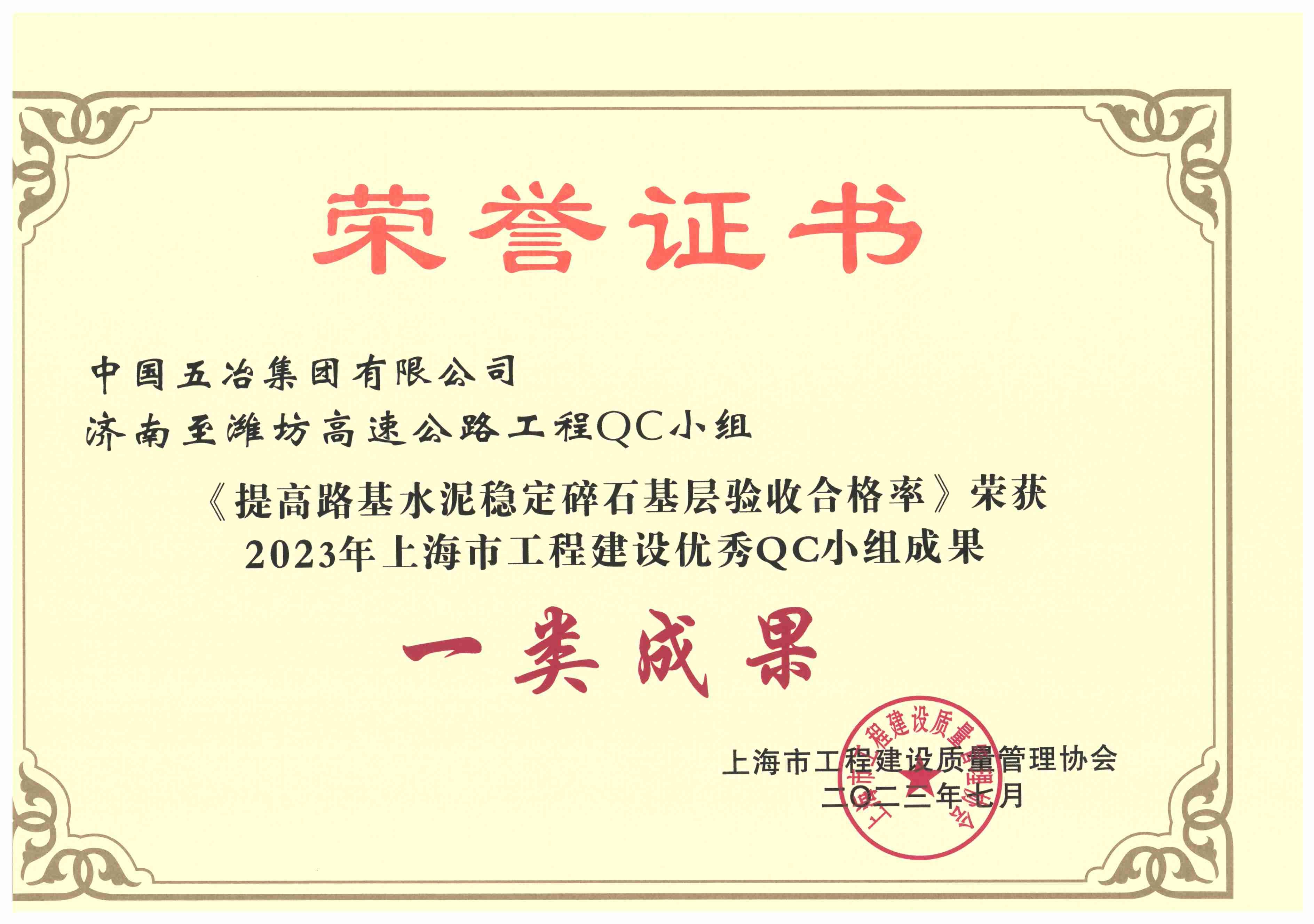 中国五冶集团有限公司济南至潍坊高速公路工程QC小组《提高路基水泥稳定碎石基层验收合格率》荣获2023年上海市工程建设优秀QC小组成果一类成果