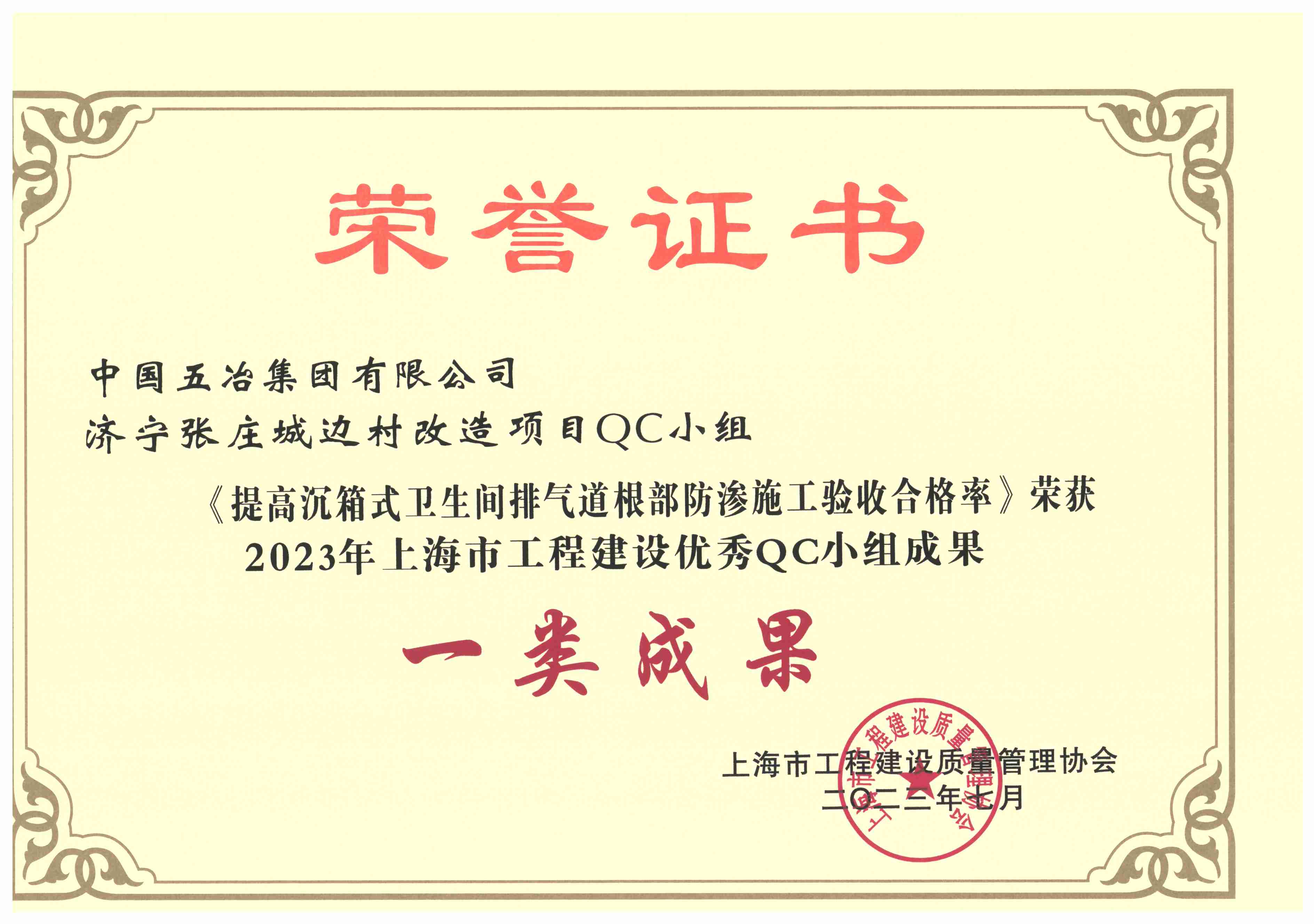 中国五冶集团有限公司济宁张庄城边村改造项目QC小组《提高沉箱式卫生间排气道根部防渗施工验收合格率》荣获2023年上海市工程建设优秀QC小组成果一类成果