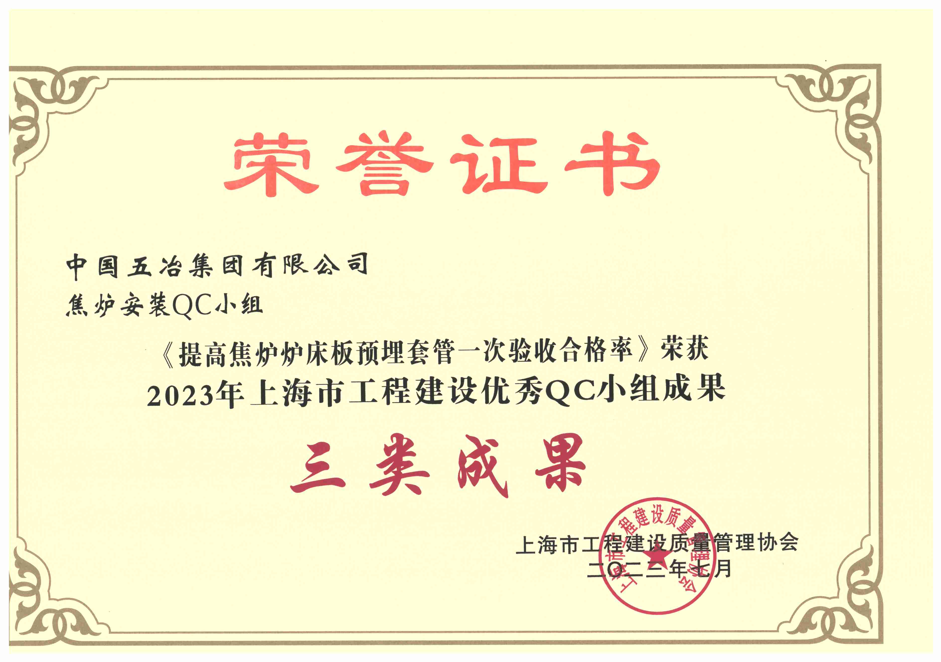 中国五冶集团有限公司焦炉安装QC小组《提高焦炉炉床板预埋套管一次验收合格率》荣获2023年上海市工程建设优秀QC小组成果三类成果