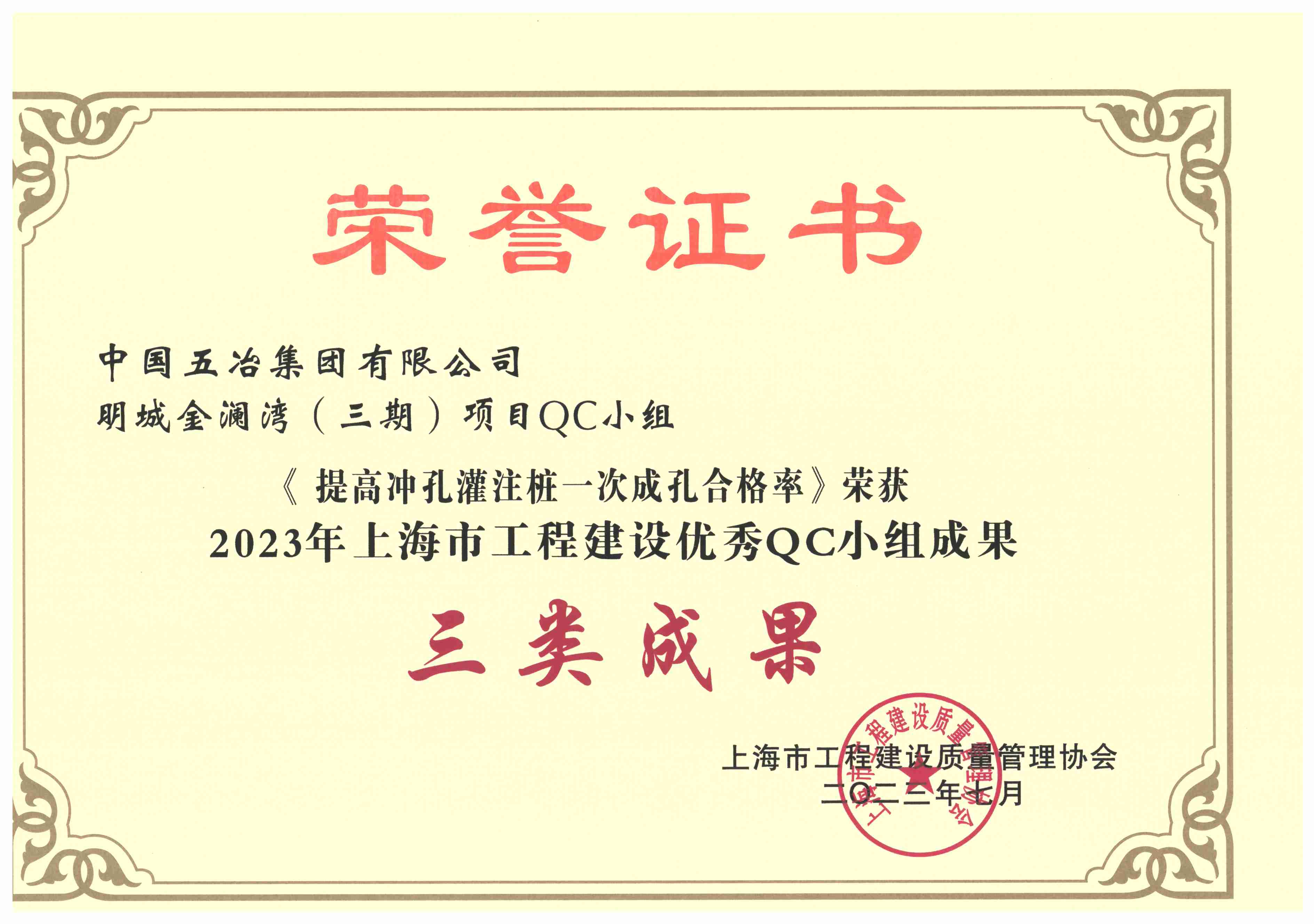 中国五冶集团有限公司明城金澜湾(三期)项目QC小组《提高冲孔灌注桩一次成孔合格率》荣获2023年上海市工程建设优秀QC小组成果三类成果