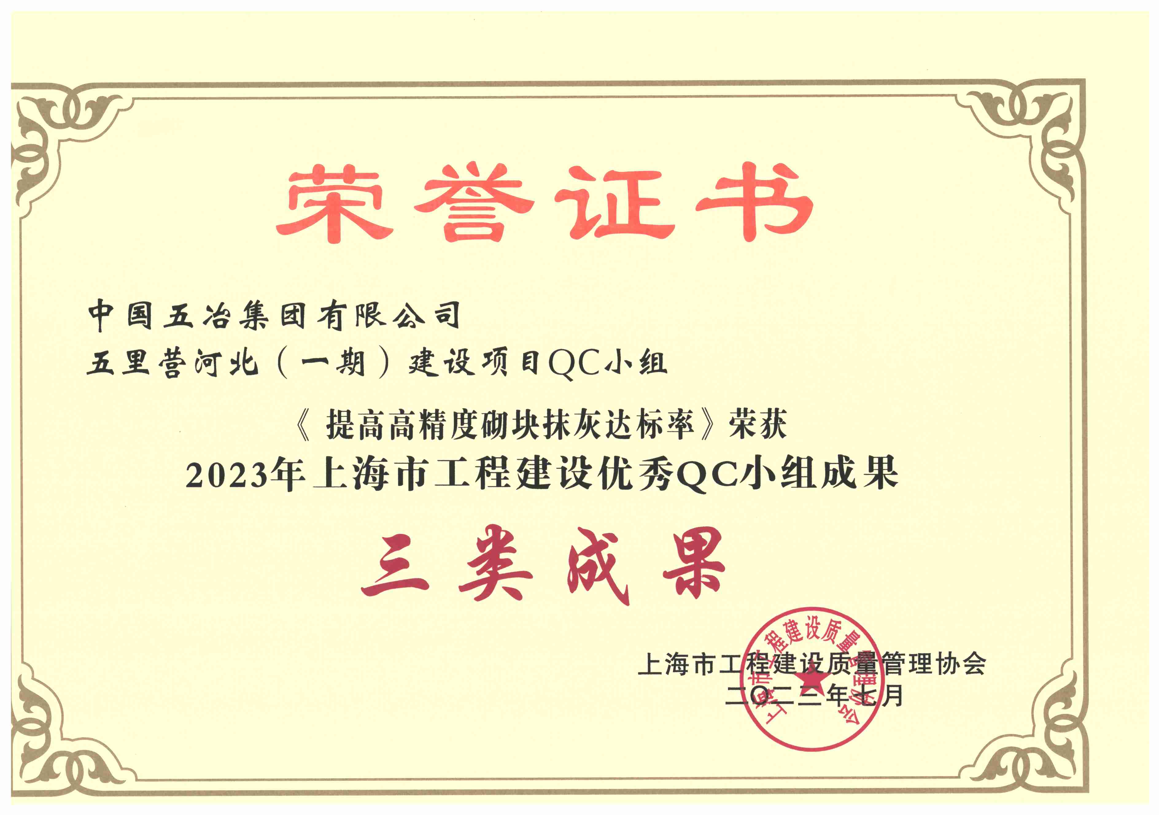 中国五冶集团有限公司五里营河北(一期)建设项目QC小组《提高高精度砌块抹灰达标率》荣获2023年上海市工程建设优秀QC小组成果三类成果