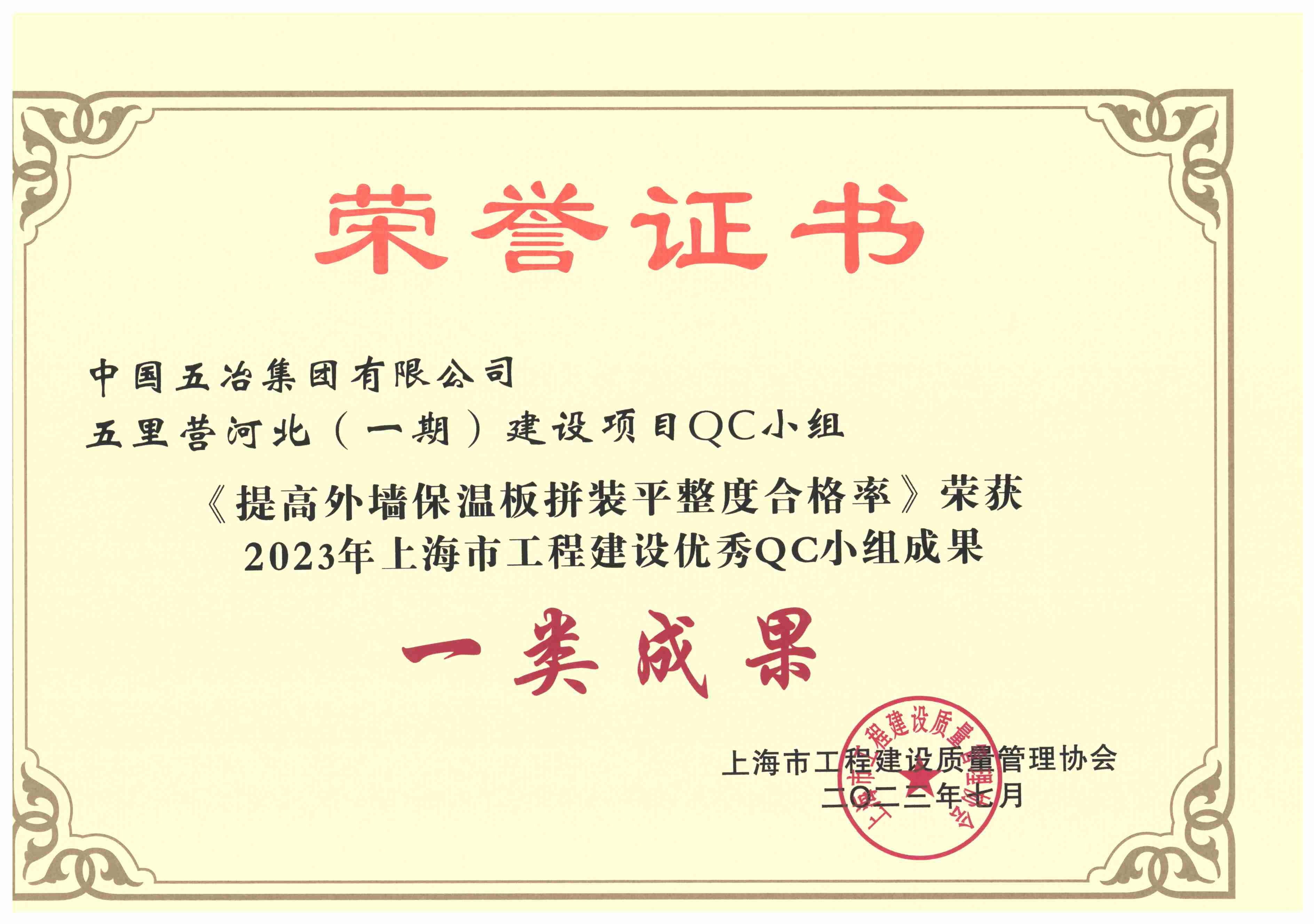 中国五冶集团有限公司五里营河北(一期)建设项目QC小组《提高外墙保温板拼装平整度合格率》荣获2023年上海市工程建设优秀QC小组成果一类成果