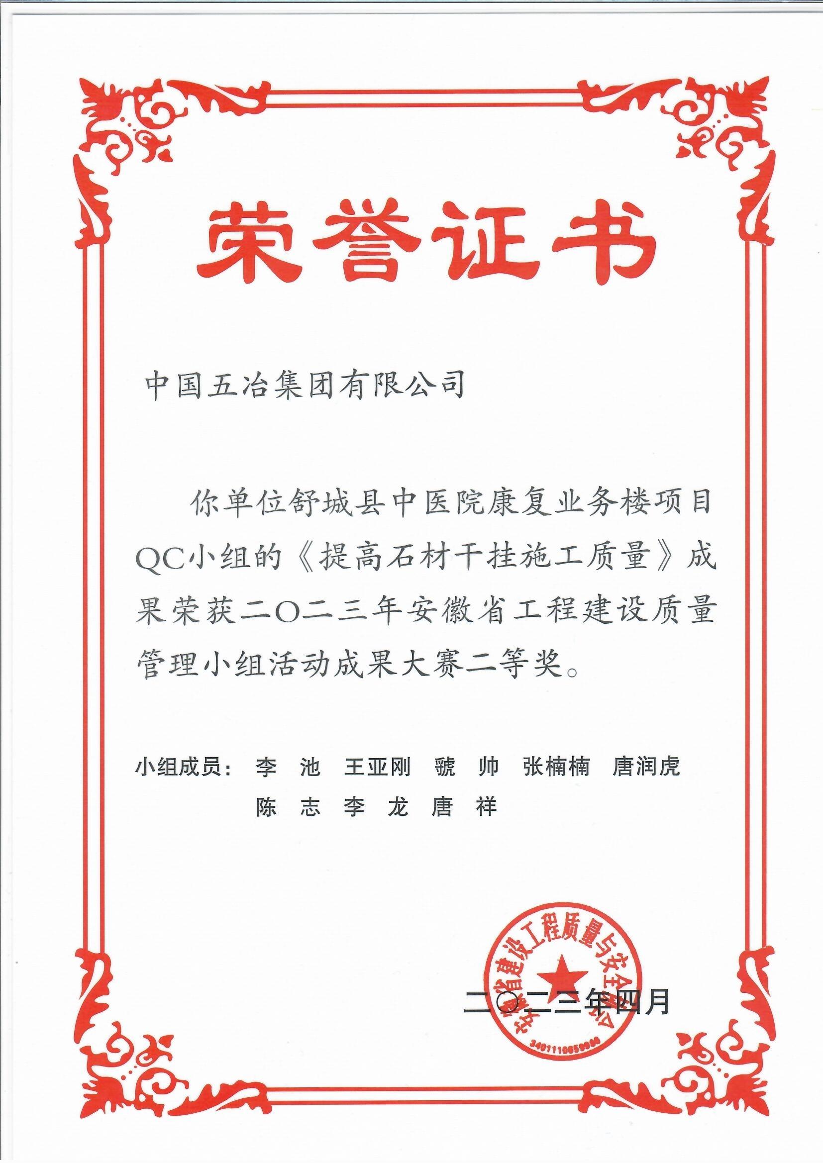 舒城县中医院康复业务楼项目QC小组的《提高石材干挂施工质量》成果荣获2023年安徽省工程建设质量管理小组活动成果大赛二等奖