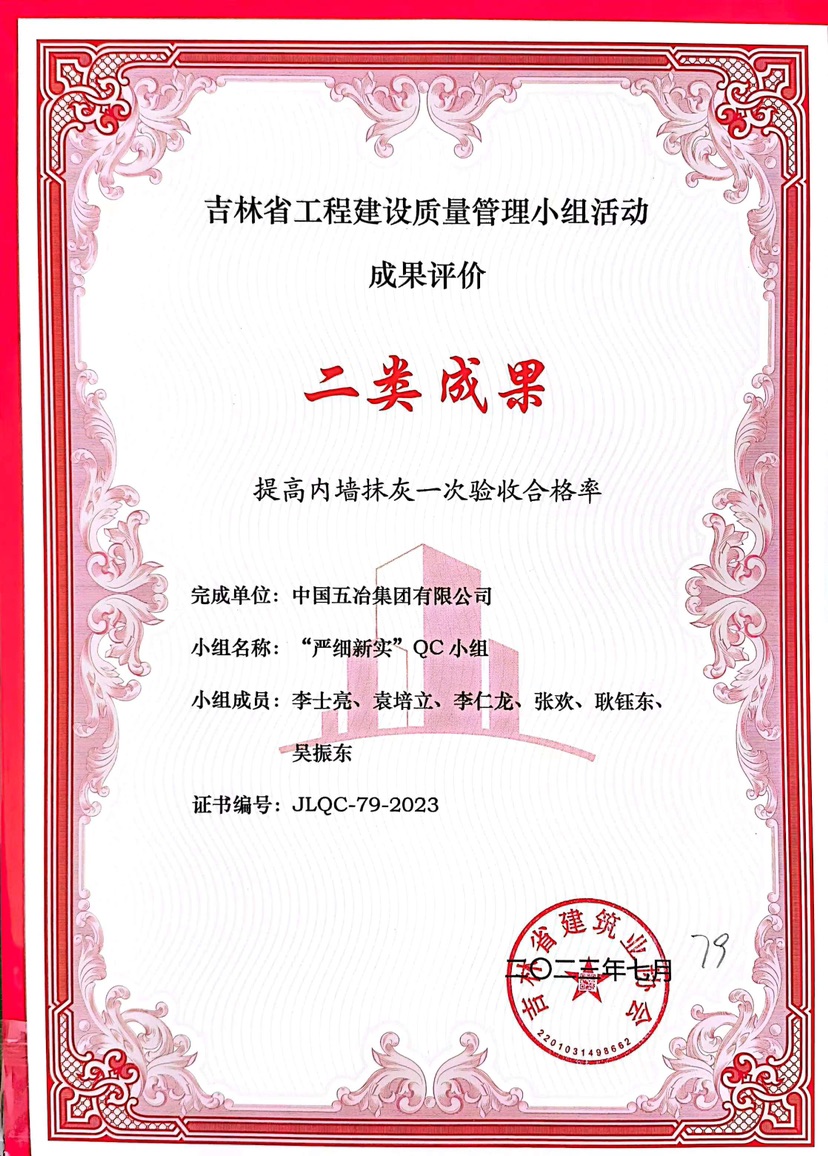 “严细新实”QC小组《提高内墙抹灰一次验收合格率》荣获吉林省工程建设质量管理小组活动成果评价二类成果