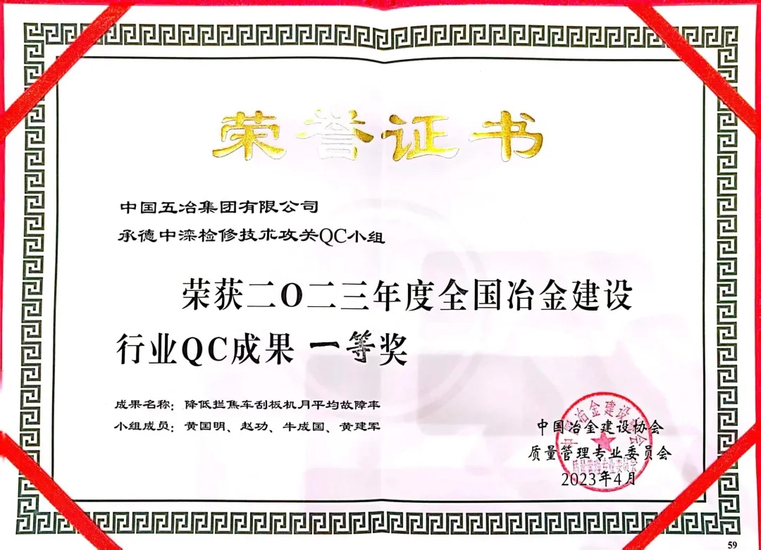 承德中滦检修技术攻关QC小组《降低拦焦车刮板机月平均故障率》荣获二0二三年度全国冶金建设行业QC成果一等奖
