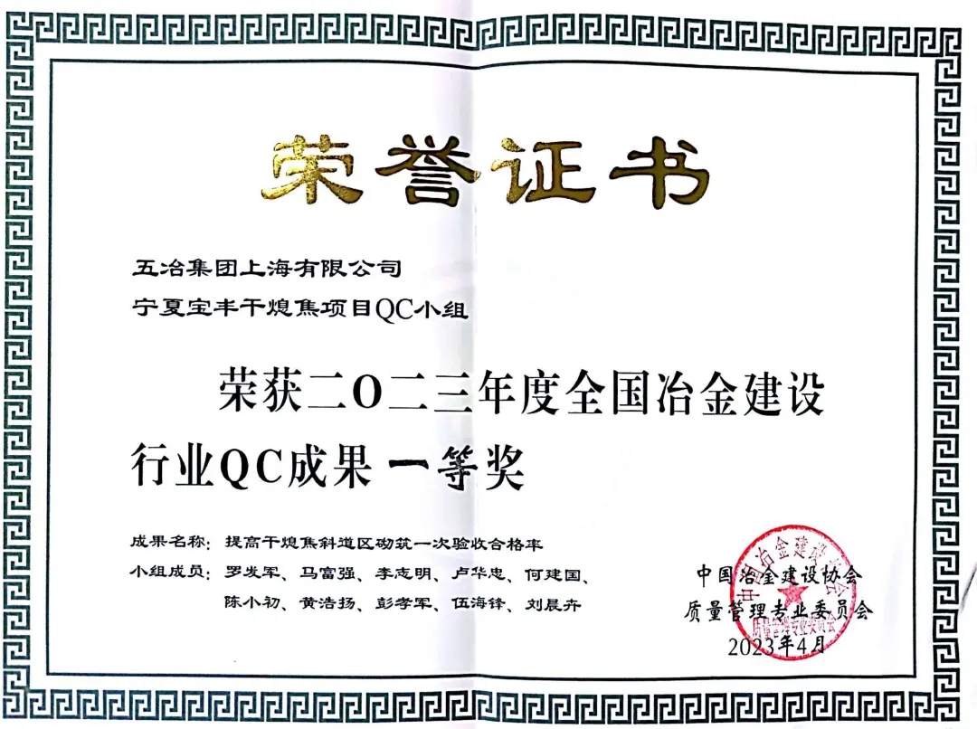 宁夏宝丰干熄焦项目QC小组《提高干熄焦斜道区砌筑一次验收合格率》荣获二О二三年度全国冶金建设行业QC成果一等奖