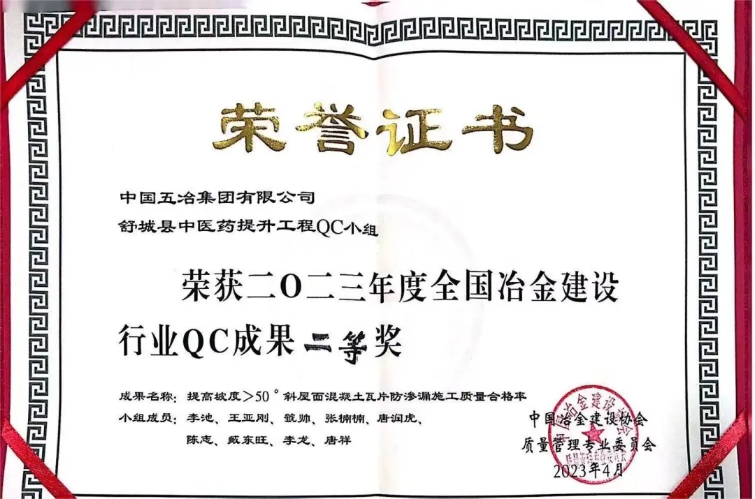 舒城县中医药提升工程QC小组《提高坡度大于50度斜屋面混凝土瓦片防渗漏施工质量合格率》荣获2023年度全国冶金建设行业QC成果二等奖