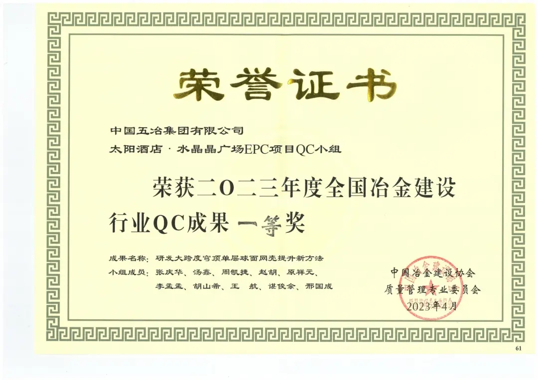 太阳酒店·水晶晶广场EPC项目OC小组《研发大跨度穹顶单层球面网壳提升新方法》荣获2023年度全国冶金建设行业QC成果一等奖