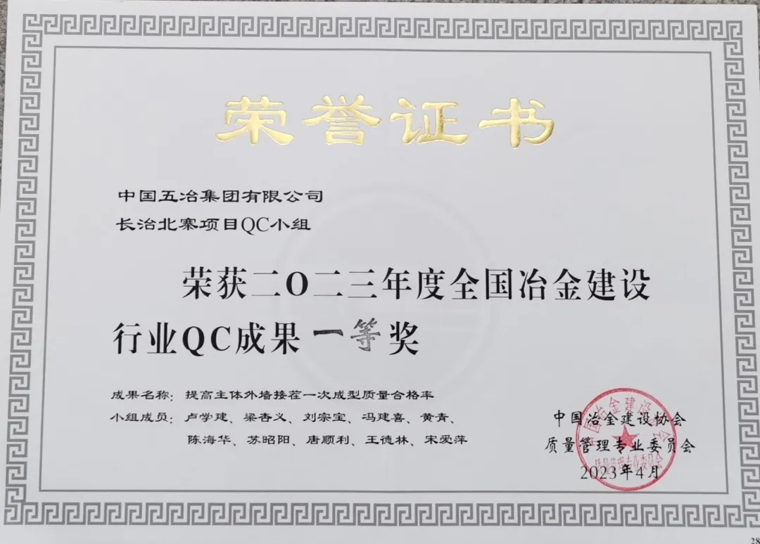 长治北寨项目QC小组《提高主体外墙接茬一次成型质量合格率》荣获2023年度全国冶金建设行业QC成果一等奖