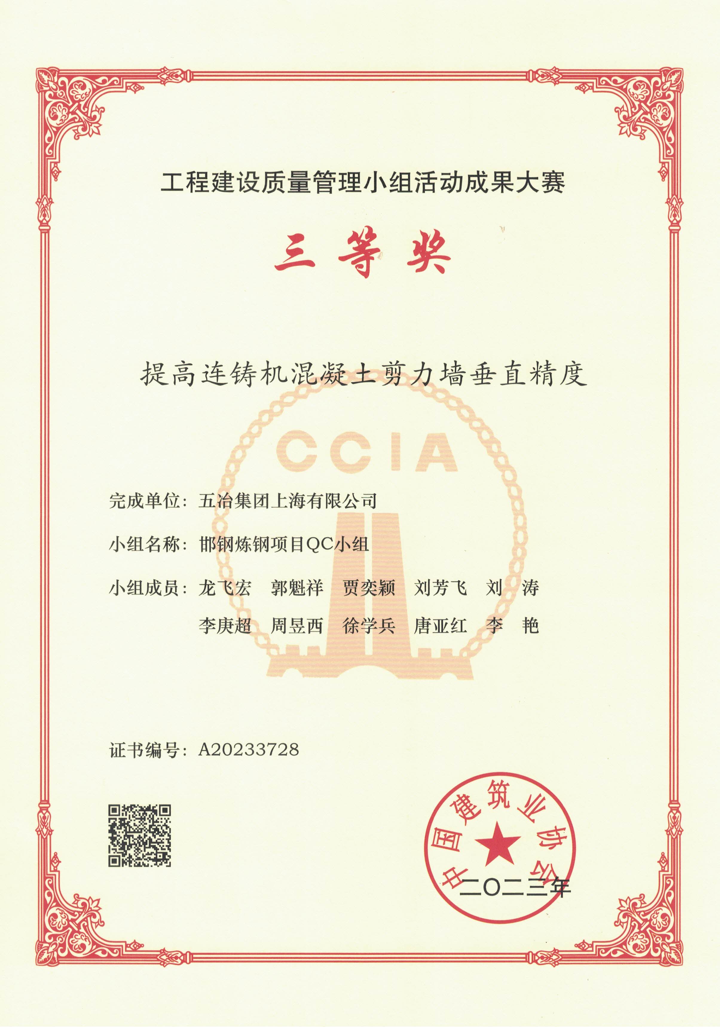邯钢炼钢项目QC小组《提高连铸机混凝土剪力墙垂直精度》工程建设质量管理小组活动成果大赛三等奖