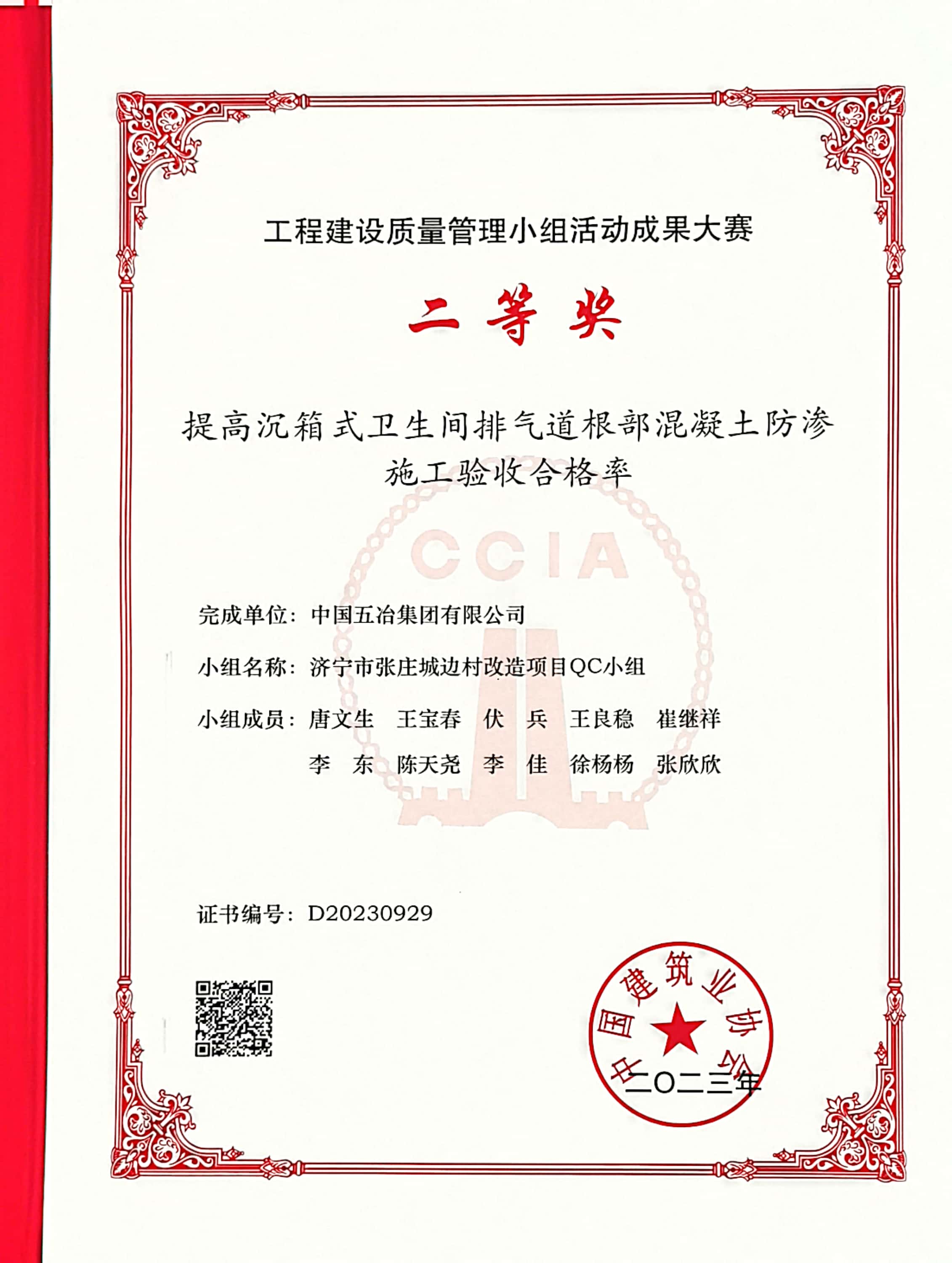 济宁市张庄城边村改造项目QC小组《提高沉箱式卫生间排气道根部混凝土防渗施工验收合格率》工程建设质量管理小组活动成果大赛二等奖