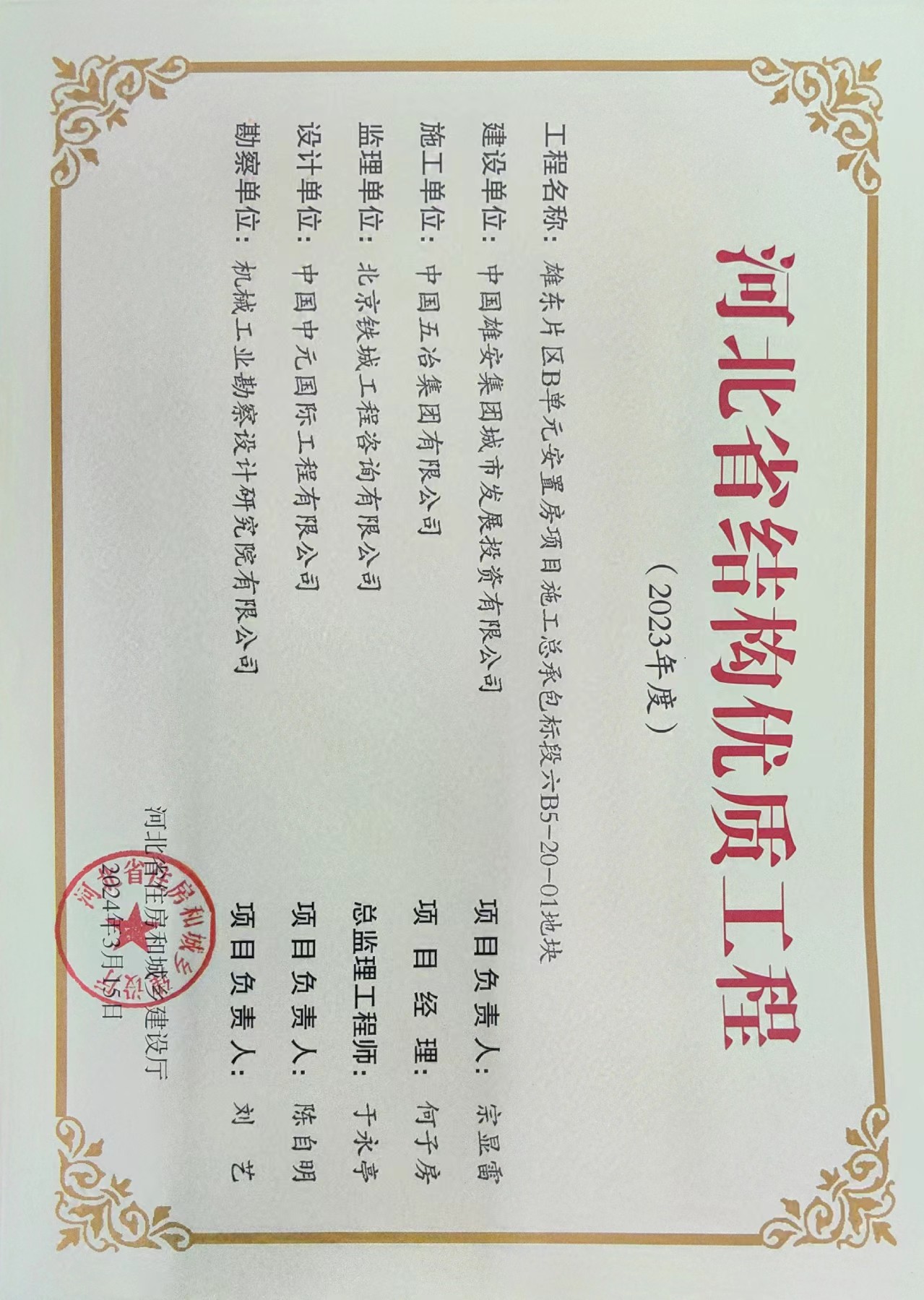 华北公司雄东片区B单元安置房项目施工总承包标段六B5-20-01地块荣获2023年河北省结构优质
