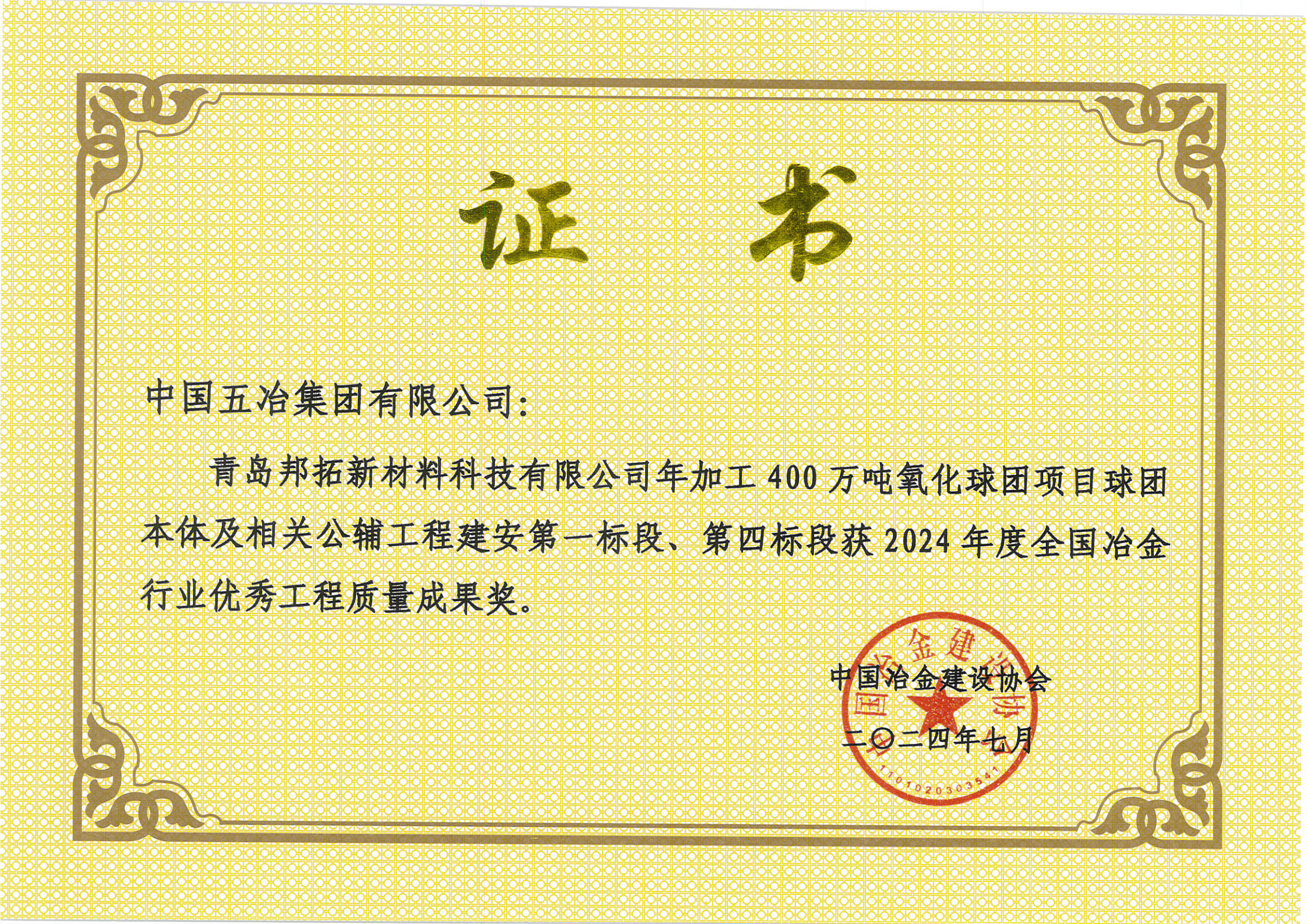 青岛邦拓新材料科技有限公司年加工400万吨氧化球团项目球团本体及相关公辅工程建安第一标段、第四标段获2024年度全国冶金行业优秀工程质量成果奖
