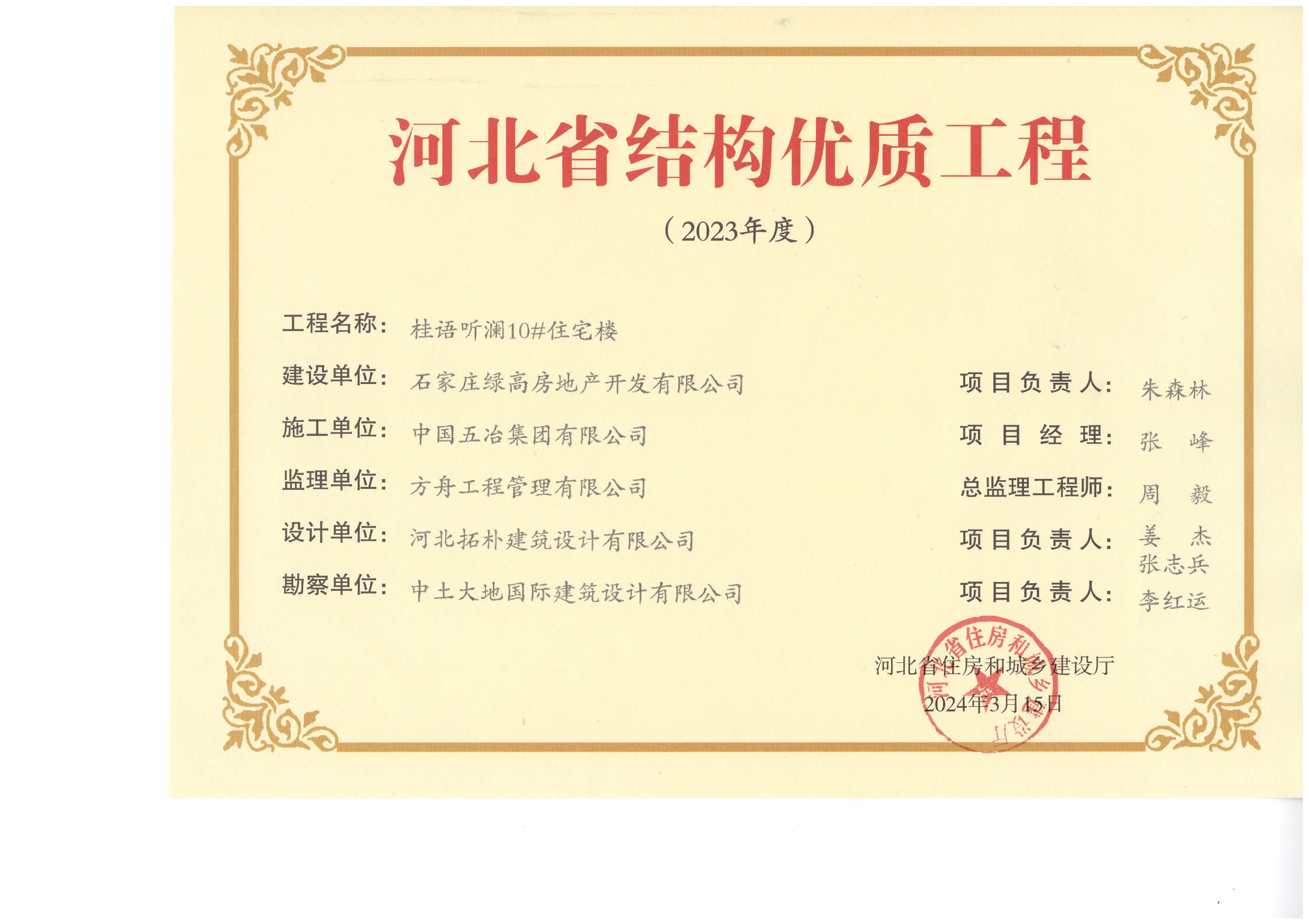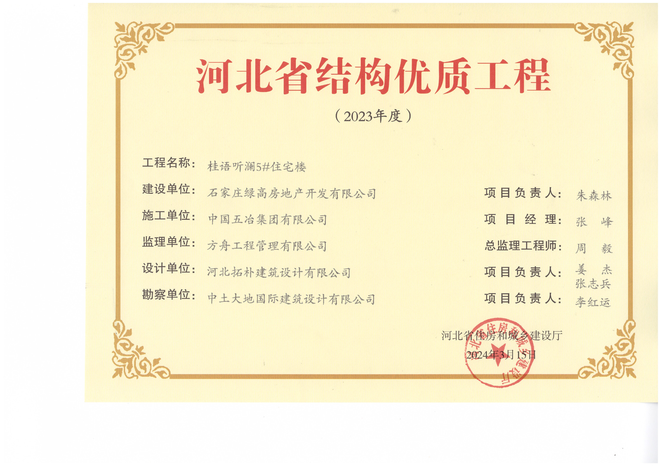 华北公司桂语听澜5#住宅楼荣获2023年河北省优质结构