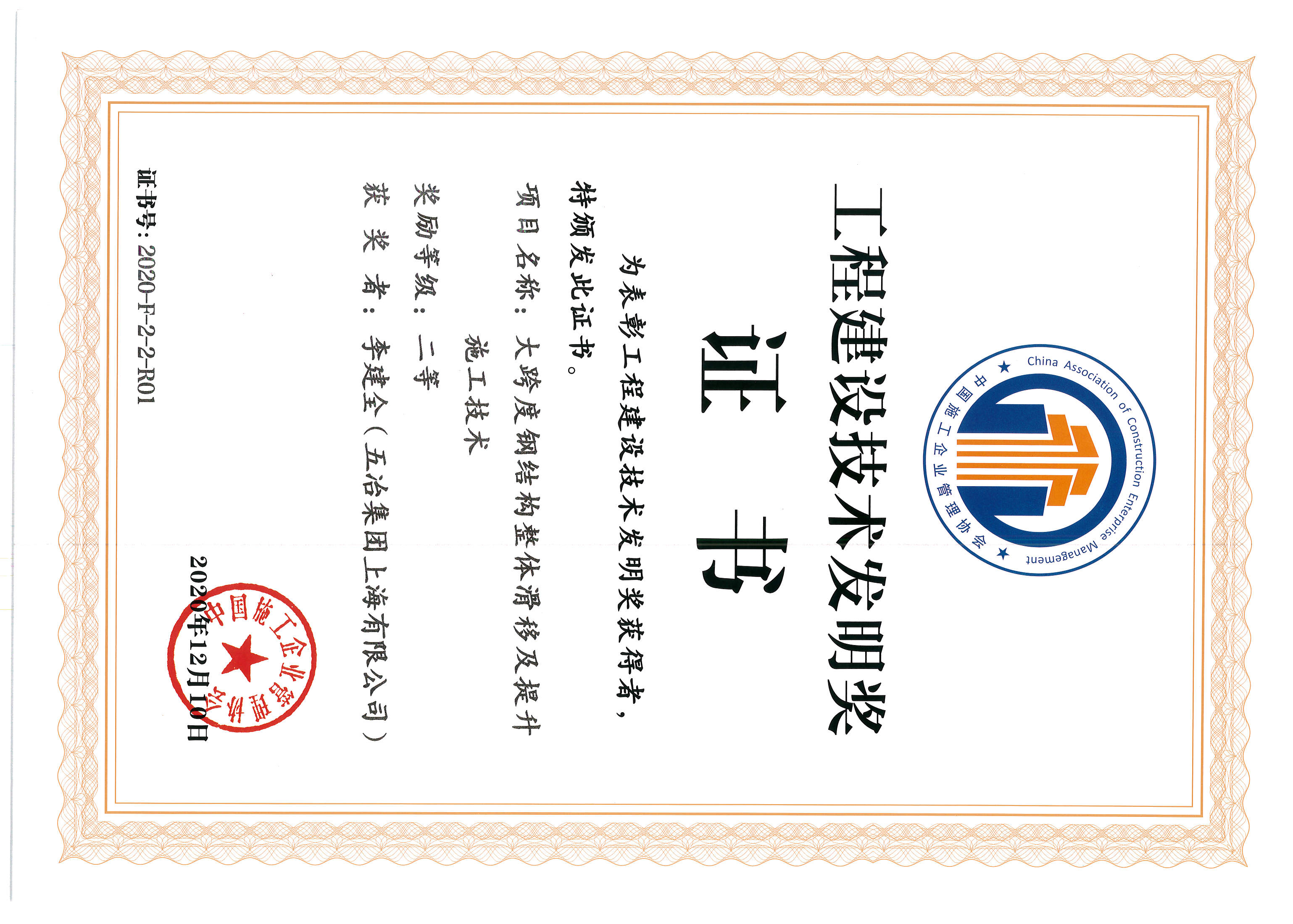 2020年中施企协技术发明奖二等奖(大跨度钢结构整体滑移及提升施工技术)