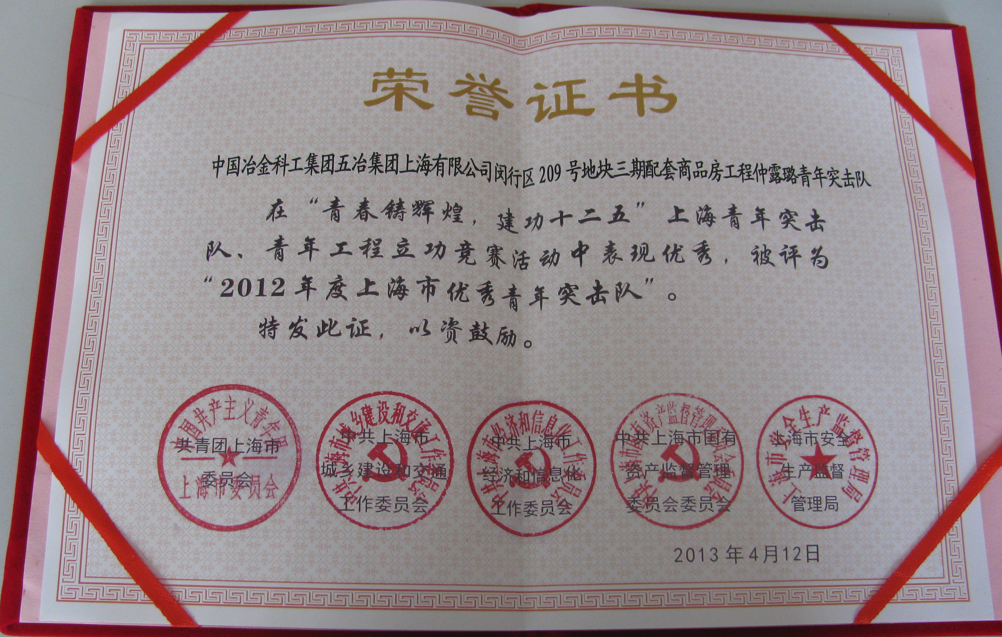 近日,五冶集团上海有限公司建筑、房地产分公司闵行区209号地块三期配套商品房工程仲露璐青年突击队(简称仲露璐青年突击队)通过激烈竞争,在参评的众多单位中脱颖而出,荣获“2012年度上海市优秀青年突击队”称号。