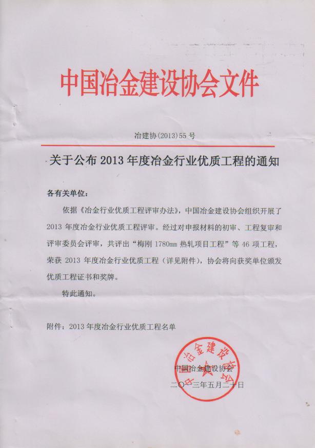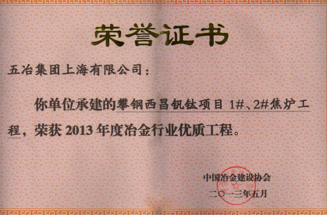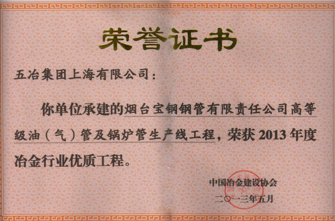 近日,由五冶集团上海有限公司承建的烟台宝钢钢管公司高等级油(气)管及锅炉管生产线工程及攀钢西昌钒钛项目1#、2#焦炉工程同时荣获“2013年度冶金行业优质工程”称号。该奖项是由中国冶金建设协会组织评审,并以通知的形式予以公布(冶建协(2013)55号文《关于公布2013年度冶金行业优质工程的通知》)。(王菁)