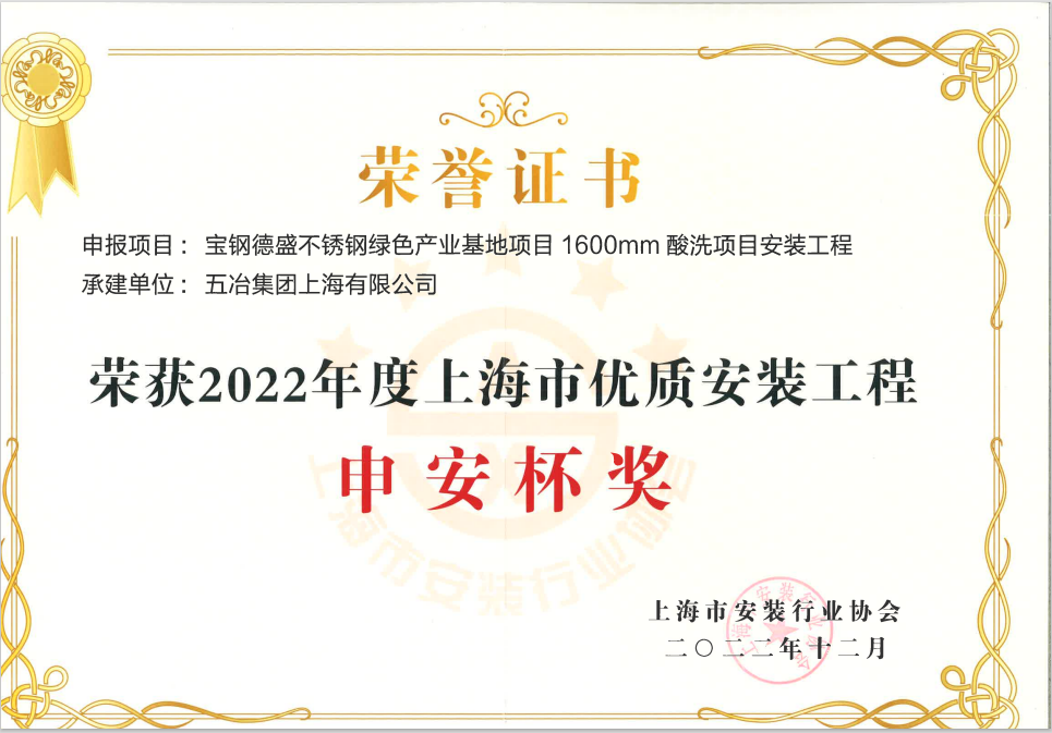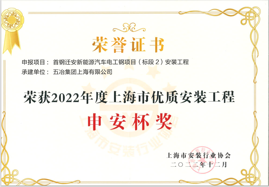 近日,上海市安装行业协会公布了2022年度上海市“申安杯”优质安装工程奖入选工程名单,五冶集团上海有限公司工程技术服务分公司承建的首钢迁安新能源汽车电工钢项目(标段2)与宝钢德盛1600酸洗项目安装工程分别荣获“2022年度上海市优质安装工程申安杯奖”。