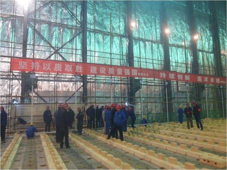 仪式结束后包钢总经理助理王纪生一行对4#焦炉土建焦炉基础顶板、抵抗墙及筑炉铺底砌筑和蓄热室砌筑准备进行了检查,对五冶的4#焦炉土建施工质量给予了高度评价:炉床板套管安装及抵抗墙混凝土浇筑质量优于包钢曾经建设的所有焦炉,包钢选择五冶承担包钢新体系焦化工程建设是正确的!王助理还详细询问了4#焦炉的砌筑工艺及工期节点和3#焦炉、煤塔、2#焦炉及2#烟囱土建施工情况。王助理对五冶的施工组织、技术管理、后勤保障等表示满意,希望五冶再接再厉在冬季来临之前快速完成3#焦炉土建,尽快形成筑炉条件,2#焦炉力争在年底完成土建施工。王永川副经理代表公司向王助理表态:3#焦炉焦炉基础顶板和抵抗墙混凝土浇筑将于10月25日左右完成,焦炉大棚11月5日前封闭,11月10日形成筑炉条件,2#焦炉将于11月底完成土建施工。