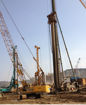 该工程项目地处大连市东港区,北向黄海湾,占据东港商务区核心地段,位于钻石海湾的岸线中央位置。D10地块用地面积21105平方米,由两栋超高层点式塔楼及4层裙房组成: 地下三层为地下停车场,地上A座为公建式公寓塔楼,68层;B座为办公与公建式公寓塔楼,63层;地上裙房4层,结构形式为内部混凝土核心筒,外部钢框架的混合结构。本工程桩基采用旋挖灌注桩。工程场地为碎石填海造地,回填深度达25m。因紧临大海,碎石渗水性强,故不能采用常规的泥浆护壁施工方法。解决回填层坍孔的唯一途径是施工时安装长护筒穿透该层而进入渗水性较差的粘土层。而安装如此深的长护筒无论是打设还是拔出都极困难,施工难度极大。同时,该项目是超高层建筑,因此桩入岩要求较常规项目高。经对各种施工工艺的实践探索,分公司成功地解决了该工程的施工难题:使用高频液压振动锤解决长护筒的打拔难题;不同钻具的配合使用解决旋挖入岩的施工效率。