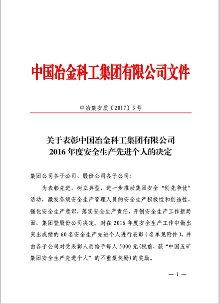 近日,中国冶金科工集团有限公司发布《关于表彰中国冶金科工集团有限公司2016年度安全生产先进个人的决定》,三公司蒙刚同志被授予“安全生产先进个人”称号。