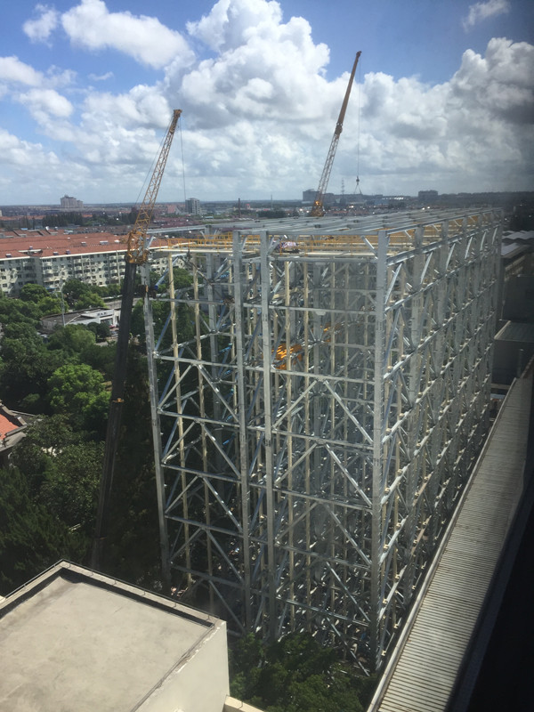 该工程位于上海市崇明区南门港街,结构形式为机械式立体智能停车库,占地面积约675平方米,南北长15米,东西宽45米,总高度36米,共18层钢结构塔库,合计408个车位,其中轿车车库360个,SUV车库48个。车库钢结构施工于7月1日开始历时54天,钢结构总重1200余吨。
