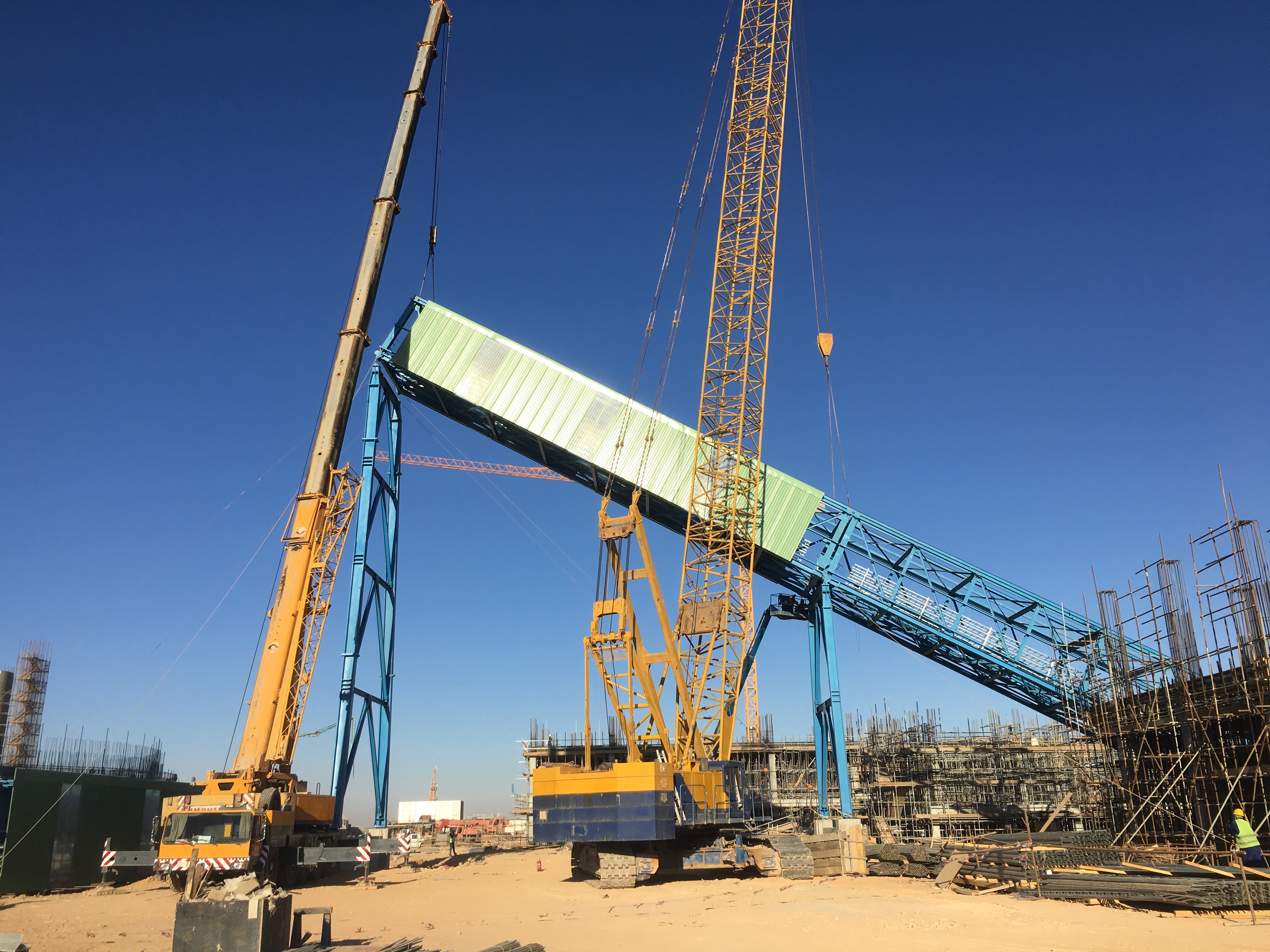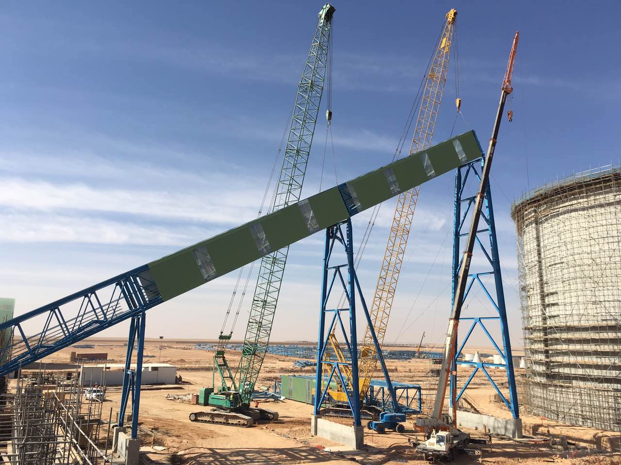 沙特当地时间2017年12月27日上午10点45分,1号线熟料输送通廊(4T1.BG01)第三段顺利吊装就位。至此1号线熟料运输通廊前三段全部吊装完成,剩余两段将结合熟料库锥顶同步吊装。