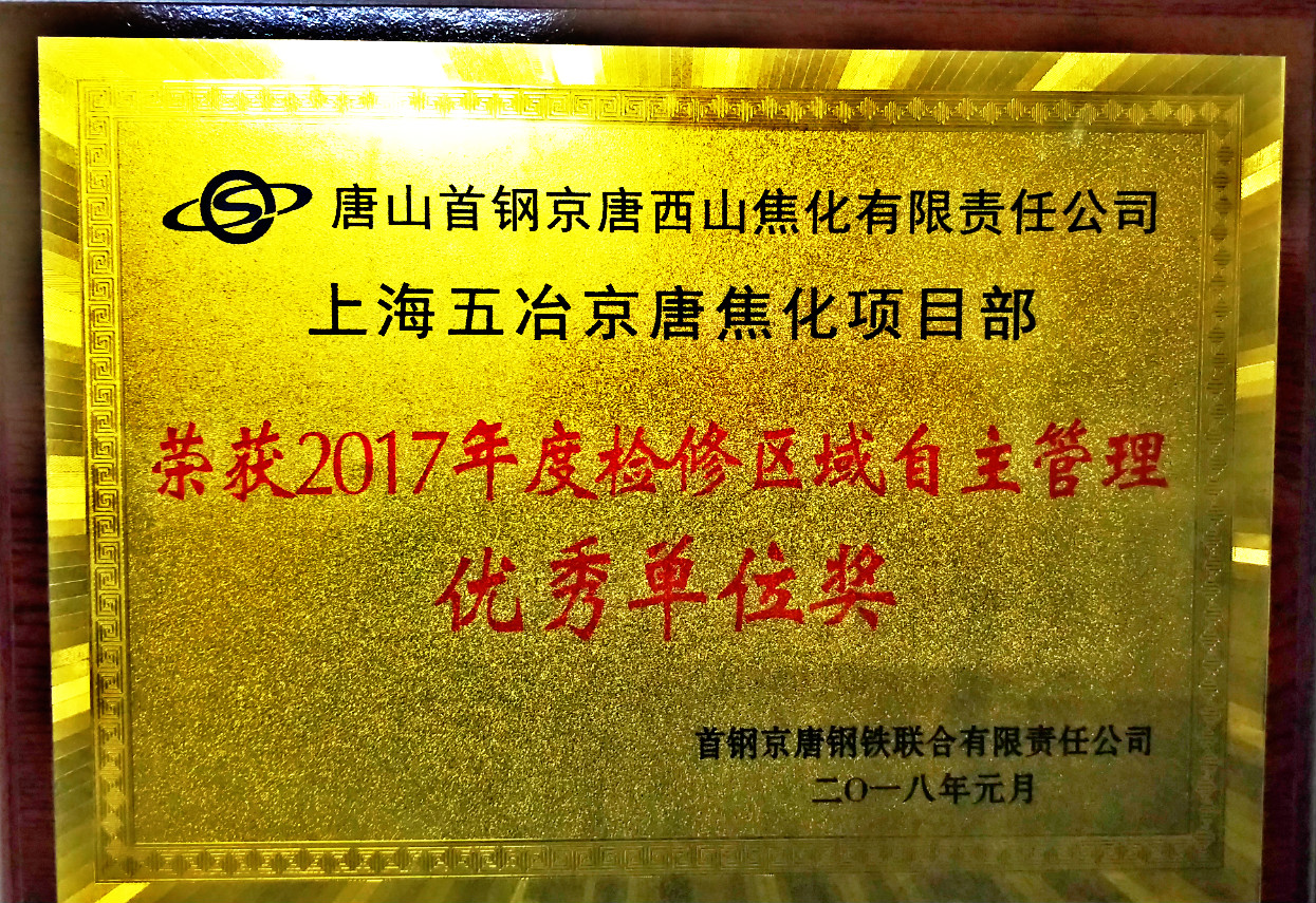 近日,检修京唐分公司在首钢京唐钢铁联合有限公司2017年表彰大会中再次荣获“年修先进单位”荣誉称号,同时也获得多个“2017年检修区域自主管理优秀单位奖”、“精益管理最佳推进个人”等奖项。 据悉,五冶检修京唐焦化项目部已连续四年获此殊荣,既是激励、也是鞭策。充分反映了甲方对五冶检修京唐分公司工作的肯定和认可,同时也表达了甲方对新一年安全与精益管理工作的期望。检修京唐分公司各项目部将再接再厉、精诚团结,努力为甲方提供更优的服务,牢树五冶检修品牌。(朱文文 文/图)