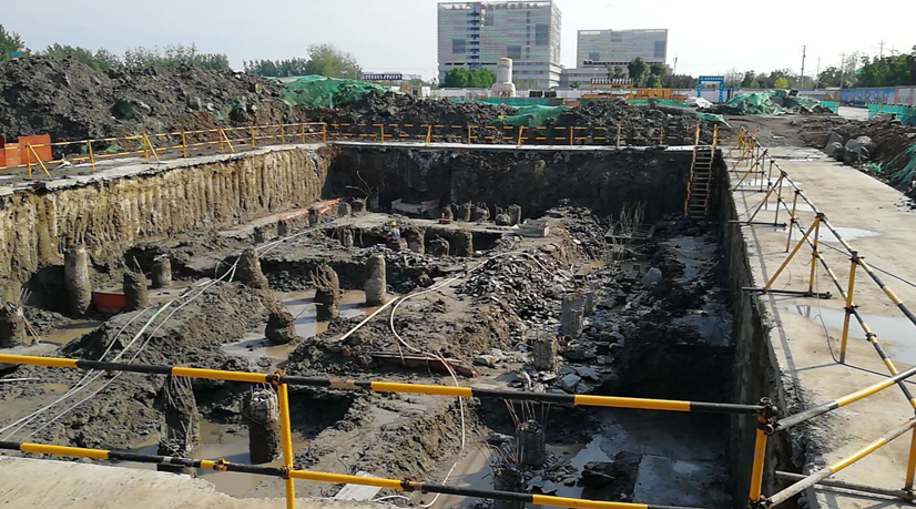 为确保基坑开挖作业时的安全,南京项目部严格遵守“开槽支撑、先撑后挖、分层开挖、严禁超挖”的规定。当基坑较大且深浅不同时,先进行浅区部分开挖,待浅区部分达到稳定安全部位后,再进行深区域部位开挖。当基坑两侧土压力差较大时,对土压力较大的一侧进行卸载。当基坑挖好后,及时查询天气预报,在下雨前用彩条布对基坑边坡进行苫盖,防止雨水渗入边坡。在雨季来临前,南京项目部充分做好雨季施工准备工作,保证有充足的防雨、防汛、防火器材,并能方便、快捷的存放使用,以供施工需要。