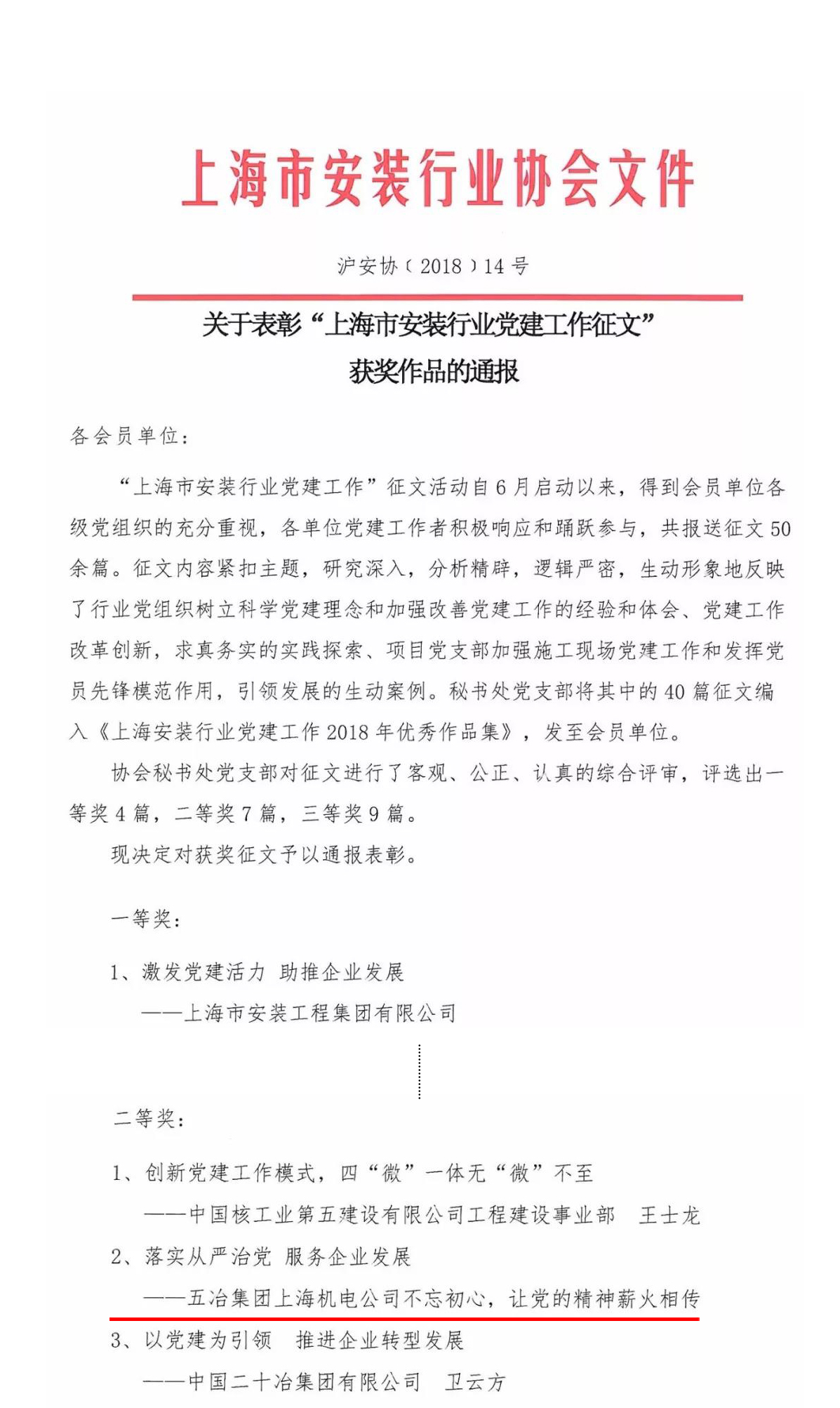 近日,上海市安装行业协会发布了《关于表彰“上海市安装行业党建工作征文”获奖作品的通报》,机电公司1篇以《落实全面从严治党 服务企业发展——五冶集团上海机电公司不忘初心,让党的精神薪火相传》为题的征文荣获二等奖。