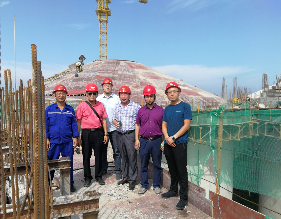 调研组听取了施工总承包单位五冶集团上海有限公司薄板事业部项目经理苏元洪关于工程概况和施工进度的汇报,实地考察了在建浅圆仓项目工地,了解了滑模专业分包单位宁夏亿丰建设工程有限公司滑模整体拖带锥形封顶钢桁架施工工艺、钢桁架多吊点整体提升、外挑檐滑模平台施工等技术在该项目的应用情况。