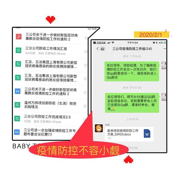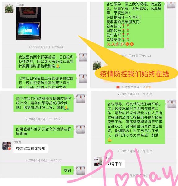 在疫情防控期间,公司各基层支部把战斗堡垒筑在了防控工作最前沿,党员干部始终坚持一线值守,身体力行,全力做好疫情防控期间的宣传引导、摸底排查、体温检测、防控知识宣贯、重点关注人群筛查管控等各项工作。疫情突然爆发,我们来不及商讨,等不及听令,谁想到、谁看到谁先动起来。党委组织部长刁继良也是公司第一支部书记主动在1月23日武汉封城的当天深夜,完成公司所有员工情况排查表;公司收文员也是第一支部组织委员汤世佑在收到群内关于新冠病毒防控通知时,不顾正在医院紧急会诊的80多岁的老父亲的安危,默默蹲在医院走廊的一角用手机转发各类信息,总是害怕错过一个关键信息,随着防疫工作深入,防疫物资采购难上加难,也是她一边奔波于医院照顾病重的父亲一边多方联系采购,最终落实了消毒液、酒精喷壶等物资。公司经采部副部长单伟也是第二支部书记,在群里看到大家共同商讨购买物资时,第一时间联系购买渠道,终于为大家购买到2万只口罩。各项目经理也是项目支部书记纷纷在所在项目地区往返于各大药房积极为职工购买防疫物资。公司党委办公室主任方梦琳自1月23日至今始终坚持在线值守,坚决做到接到上级通知第一时间下达文件;联合发挥各系统共同做好返沪人员排查、重点关注人员信息筛查、防疫工作准备等各类信息的上传下达工作。在疫情防控工作中提前部署项目人员信息、复工要求统计,为做到各系统信息共享同时为简化项目各类疫情报表,在第二支部党员干部王频、张宁美的共同努力下,统一协调各系统信息要求,简化成三公司防疫工作统计一表上报,各系统在群内自行摘取数据,做到了群内关键信息明了准确。通过大家共同努力确保了疫情排查无盲点、无遗漏、无隐患,坚决做到疫情威胁不解除,党员干部不撤退,成为防控工作的“逆行者”。