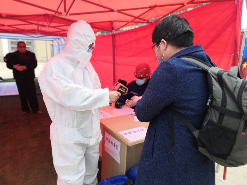 有了党支部的引领,项目部认真执行当地政府规定的“一责两案五有六到位”要求,严格落实疫情防控领导责任制。疫情暴发后项目部迅速成立了以项目经理为组长、项目班子为副组长的疫情防控领导小组,并就下设的测温部、应急部、宣传部、物资部、综合部等8个部门逐一明确了分工及责任人,全面开展项目疫情防控工作。为切实保障人员身体健康,项目部从疫情排查摸底,建档管理,设置临时隔离室,消毒保卫,防疫物资保障等多方面着手防疫工作。施工现场的出入口均设置了疫情检测点,对入场人员进行消毒和体温检测,对办公区、食堂、宿舍、厕所、施工电梯轿厢等重点区域及设施设备做好清洁和消毒,并安排单人单间、相对独立房间作为临时隔离场所;现场根据人员数量和防控需求,购置了相对充足的消毒液、口罩及红外体温探测仪等防护物资及必备医护用品,全方位做好疫情防控。