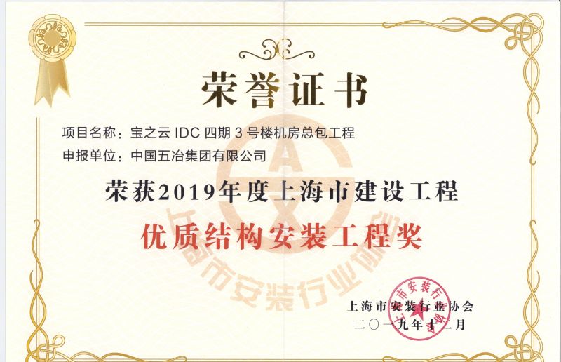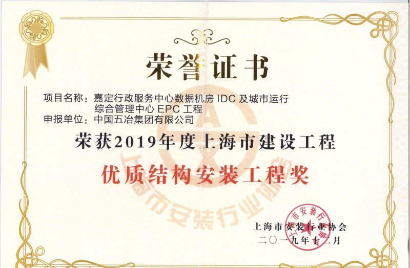 近日,从上海市安装行业协会传来喜讯,工程总承包分公司承建的宝之云IDC四期3号楼机房总包工程、嘉定行政服务中心数据机房IDC及城市运行综合管理中心EPC工程被评为“2019年度上海市建设工程优质结构安装工程”。