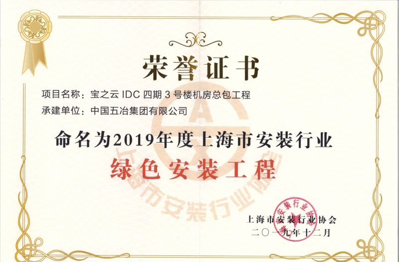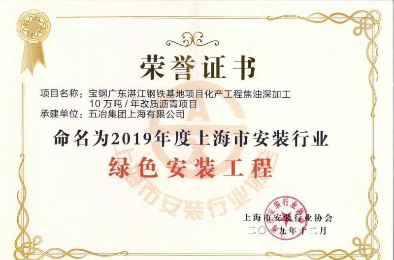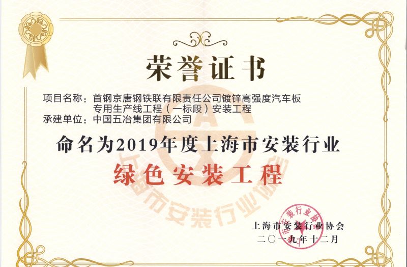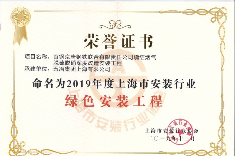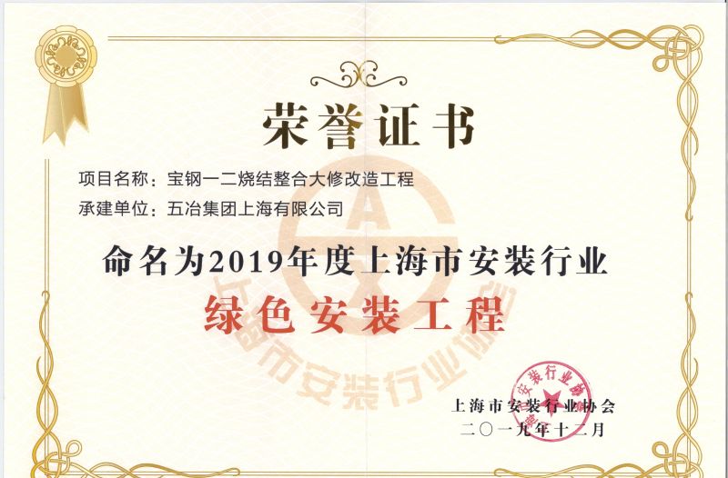 近日,从上海市安装行业协会连续传来喜讯,工程总承包分公司宝钢一二烧结整合大修改造工程、宝之云IDC四期3号楼机房总包工程、首钢京唐镀锌高强度汽车板专用生产线工程(一标段)安装工程、宝钢湛江钢铁有限公司化产工程焦油深加工10万吨/年改质沥青项目、首钢京唐钢铁联合有限责任公司烧结烟气脱硫脱硝深度改造安装工程等五个项目被评为“2019年度上海市安装行业绿色安装工程”,中国五冶集团有限公司、五冶集团上海有限公司被评为“2018-2019年度绿色安装先进集体”。